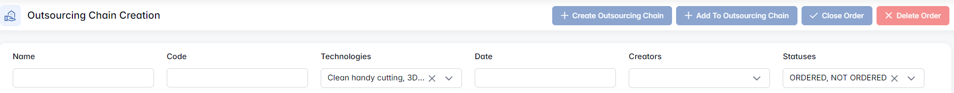 - Outsourcing Chain Creation – where procurement specialists group items, assign suppliers, and initiate sourcing chains.