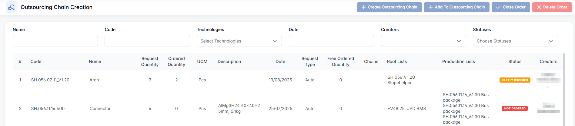 The Outsourcing Chain Creation tab allows procurement teams to group open manufacturing or assembly requests and assign them to specific suppliers. This is the core control point where outsourcing chains are initiated or extended, based on production demand and supplier availability.