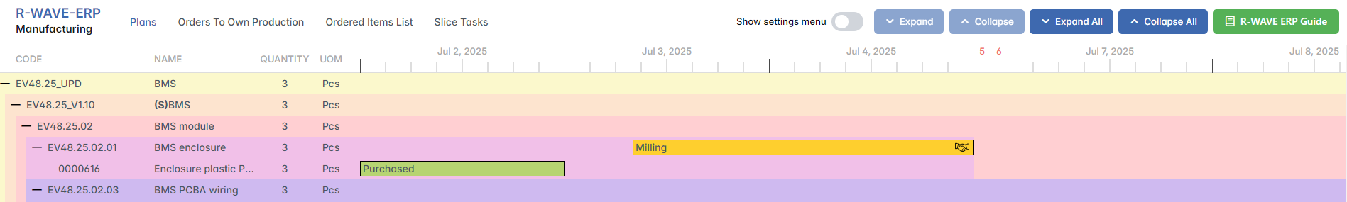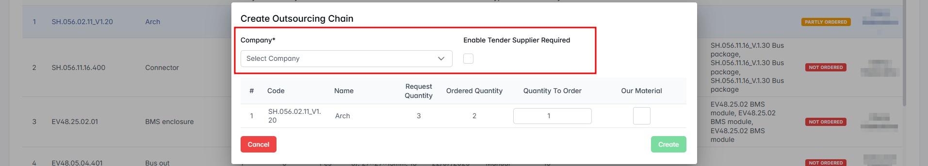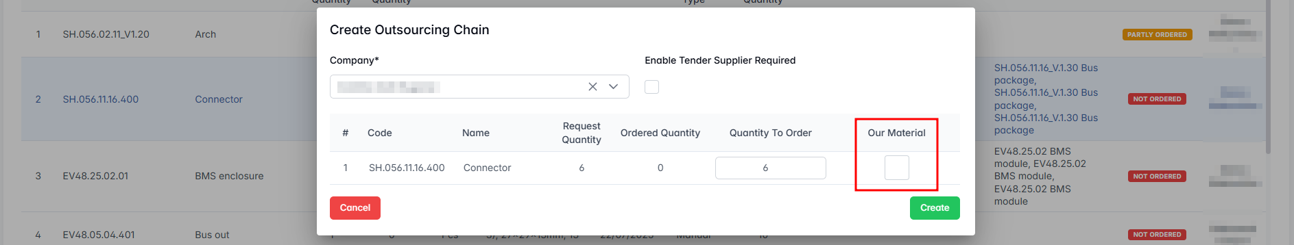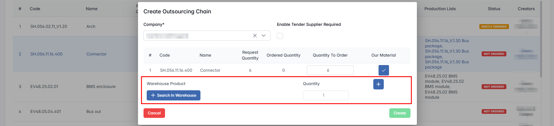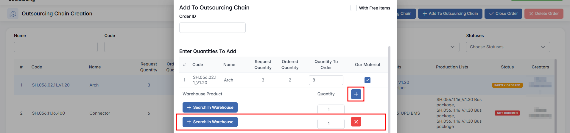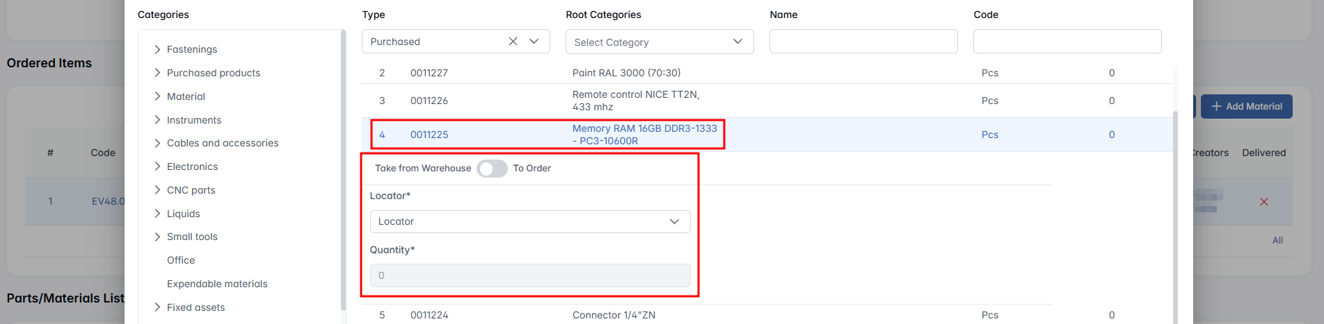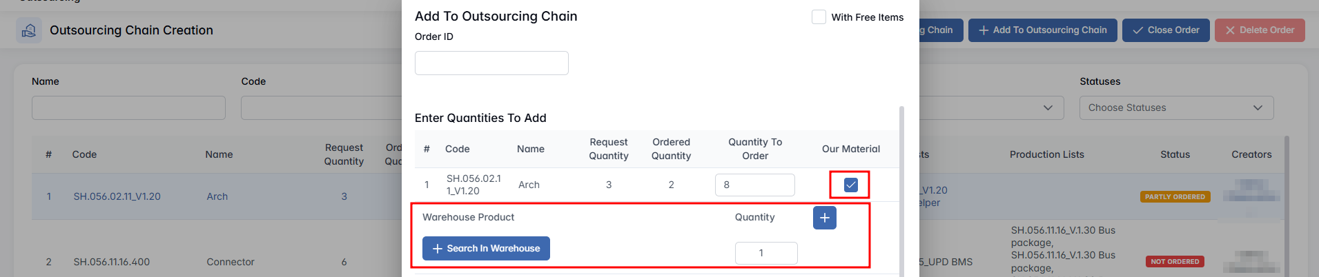 This feature allows users to link warehouse materials to specific ordered items, indicating what internal components or parts will be supplied by the company rather than sourced externally.