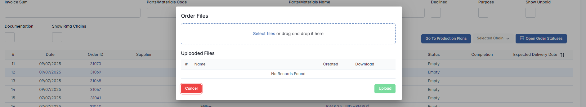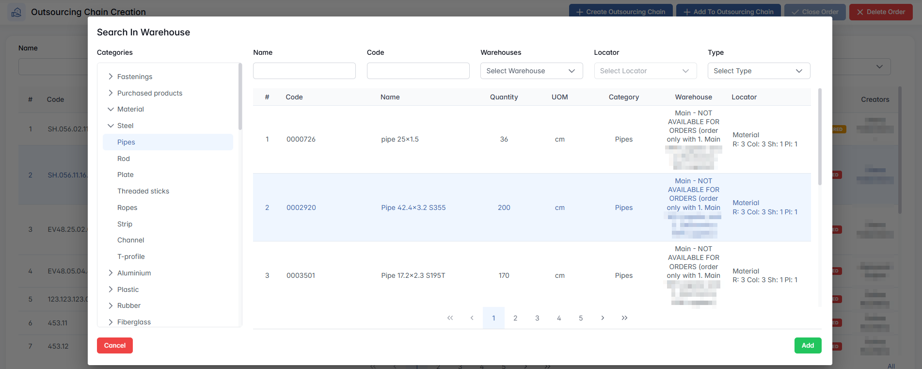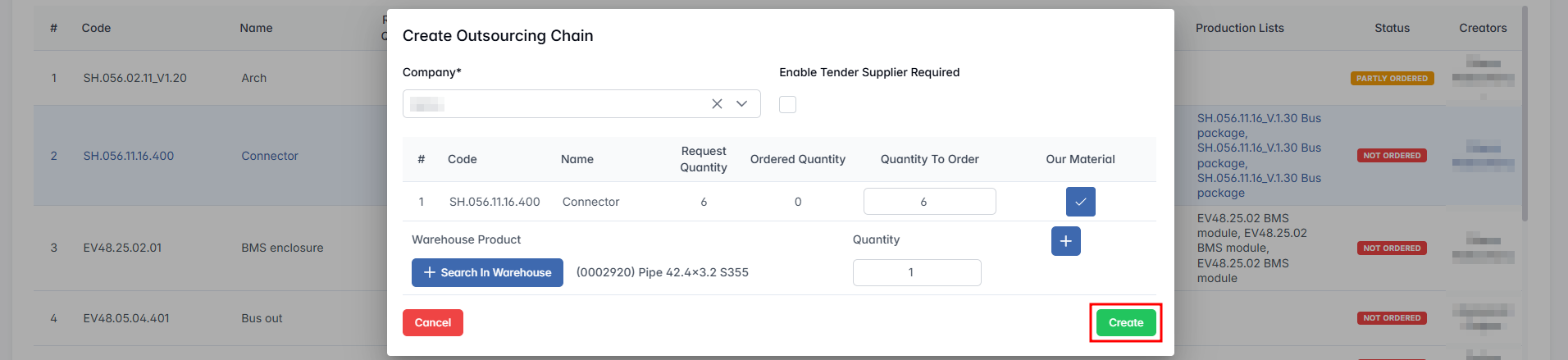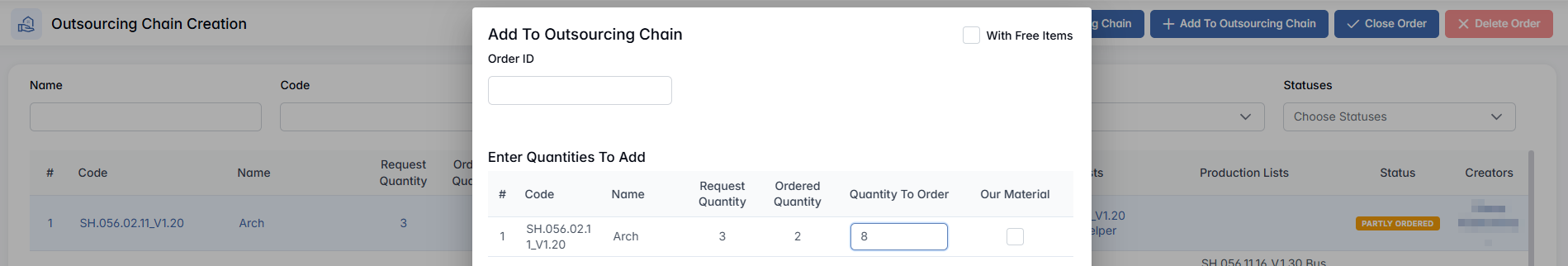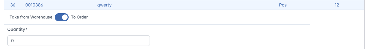 Take from Warehouse / To Order – This toggle lets the user choose whether to take the material directly from the warehouse (if it is currently in stock) or to request it through procurement (if it is not available). When set to To Order, the request will be forwarded to the procurement department to initiate the purchase of the material. Once the material is delivered to the warehouse, it will be automatically assigned to the corresponding outsourcing chain.