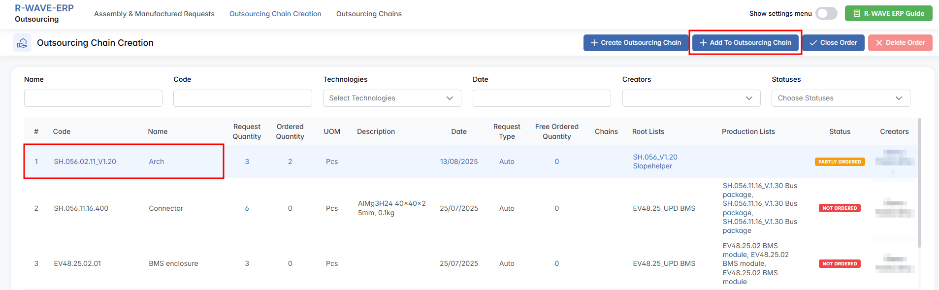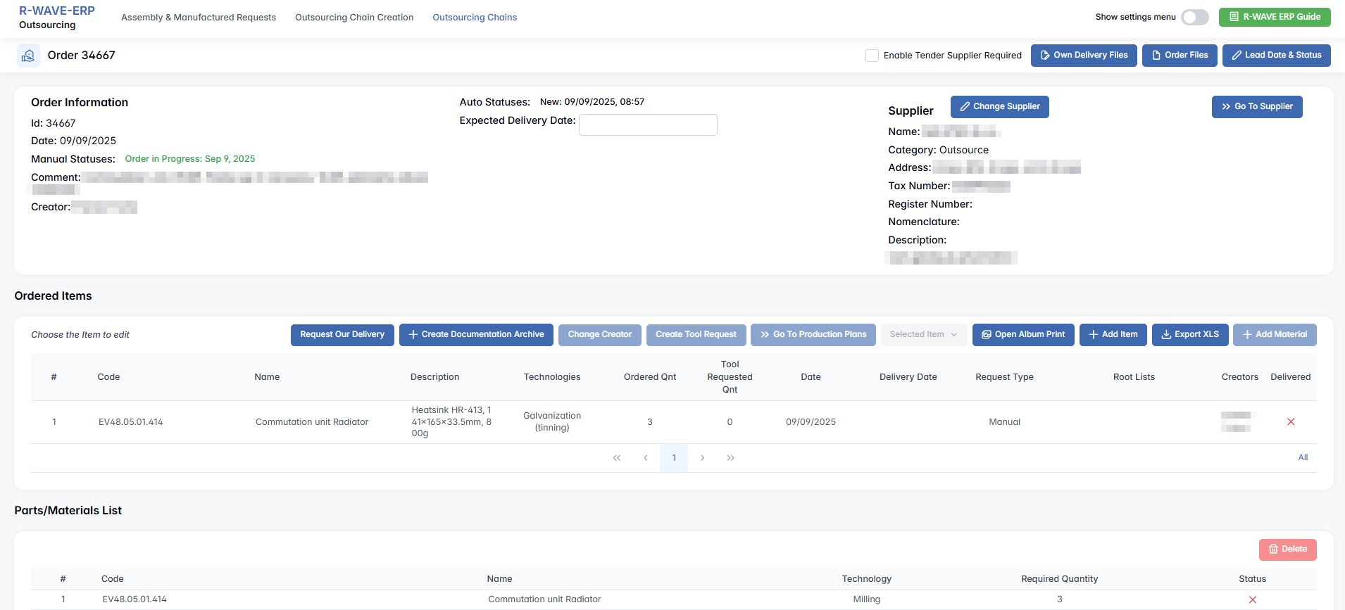 The Outsourcing module in R-Wave ERP streamlines the procurement of assemblies and manufactured parts from third-party suppliers. It supports both automatic generation of requests from production plans and manual submissions, offering flexible control over outsourced production steps.
