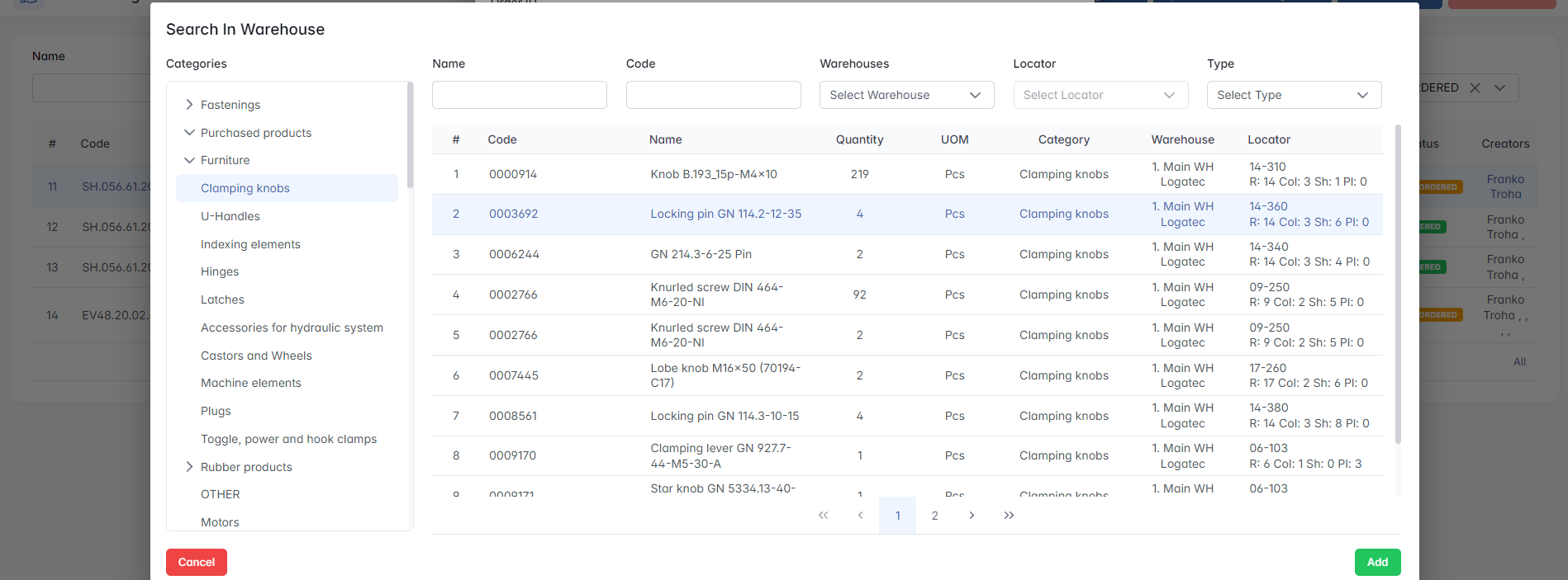 This opens the Add a New Item to Request modal window, where users can search and select items from the warehouse catalog.