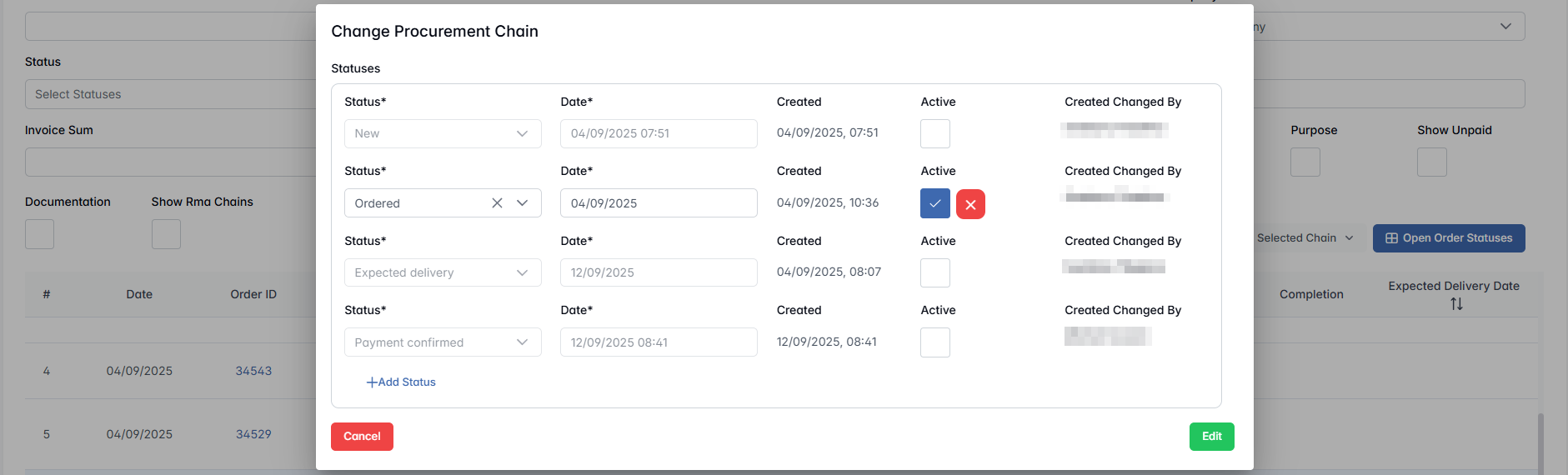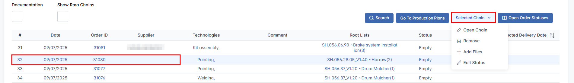 - Navigate to the Order Page of the corresponding Procurement Chain.