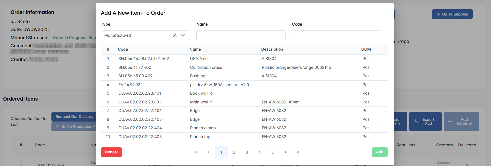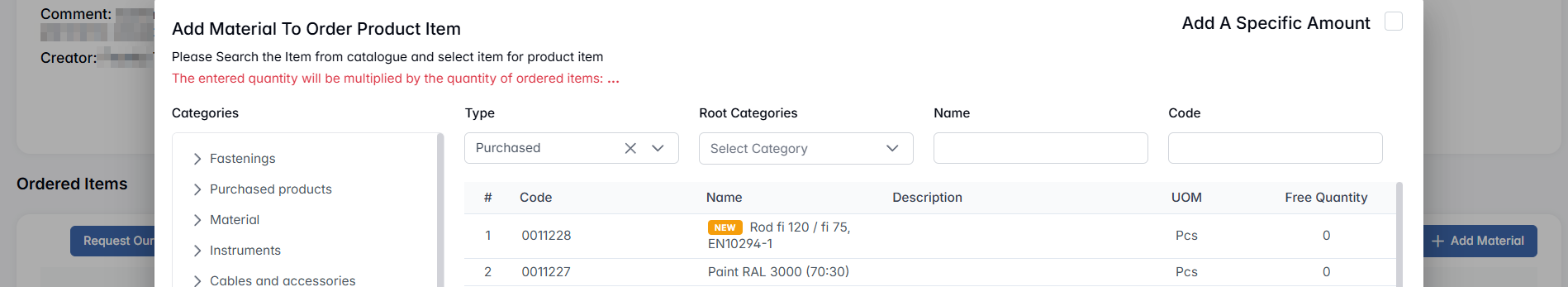 Search the item from catalog (filters: Category, Type, Root Category, Name, Code). If a material is available: