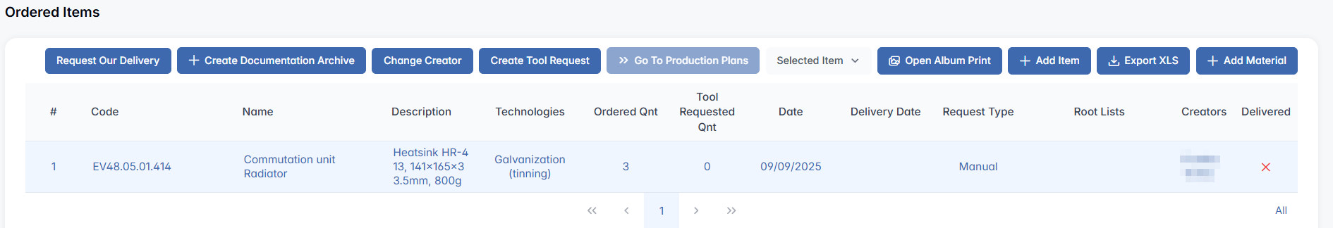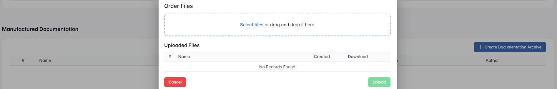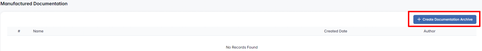 This section is used to store technical or production-related documentation linked to ordered items or assemblies. Click + Create Documentation Archive to generate a document pack.