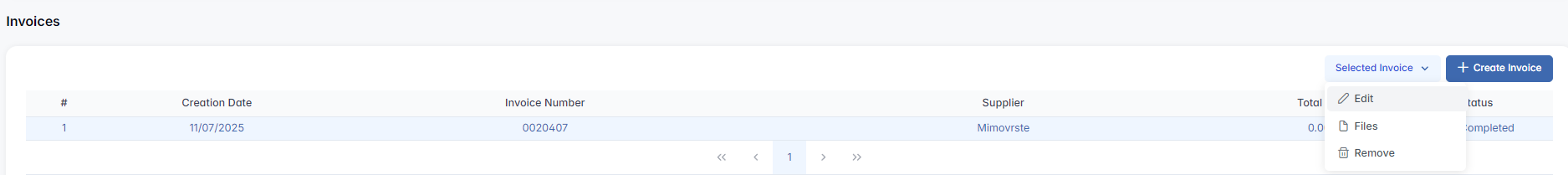 - Creation Date, Invoice Number, Supplier, Total Price, Status