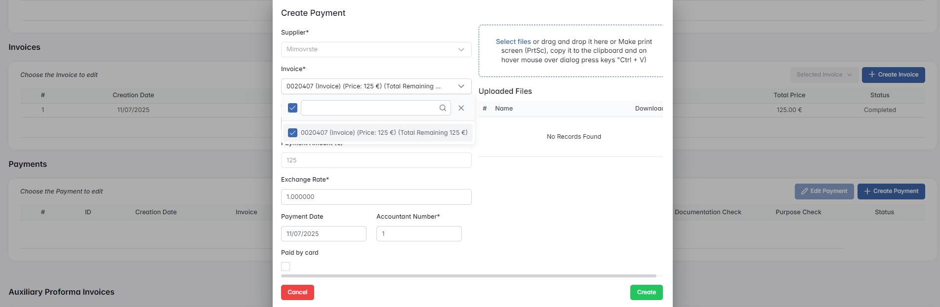 - Uploaded Files – You can attach documents that prove the payment, such as bank confirmations or screenshots. Files can be uploaded via drag-and-drop, the file picker, or pasted directly from your clipboard.