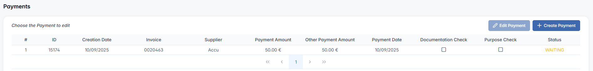 A new payment record will appear both in the Payments section of the procurement chain and in the Payments module. Initially, the status will be set to WAITING, as the payment must be confirmed through the Confirmation module under the Payments Confirmation tab.