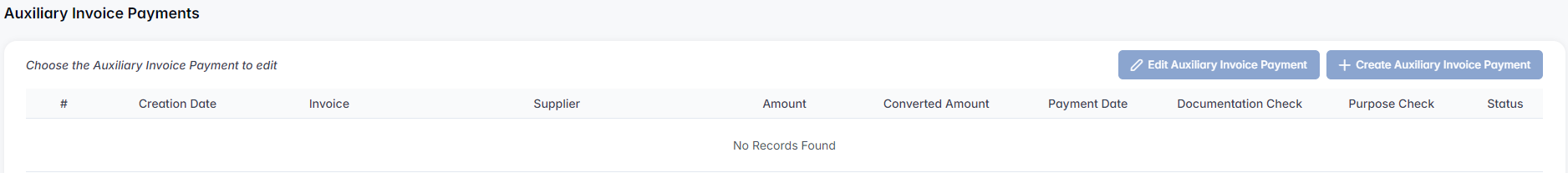 All payments related to auxiliary invoices are displayed here.
