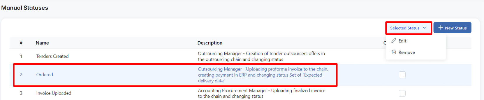 - Description — optional field to clarify the purpose of the status (e.g., Used when proforma invoice is uploaded and payment created)
