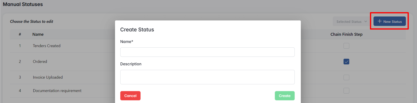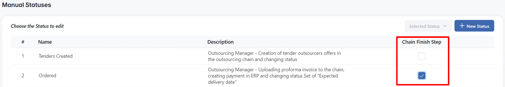 The Chain Finish Step checkbox allows you to mark a status as the final stage of the chain. This can help visually indicate completion or readiness for closure.