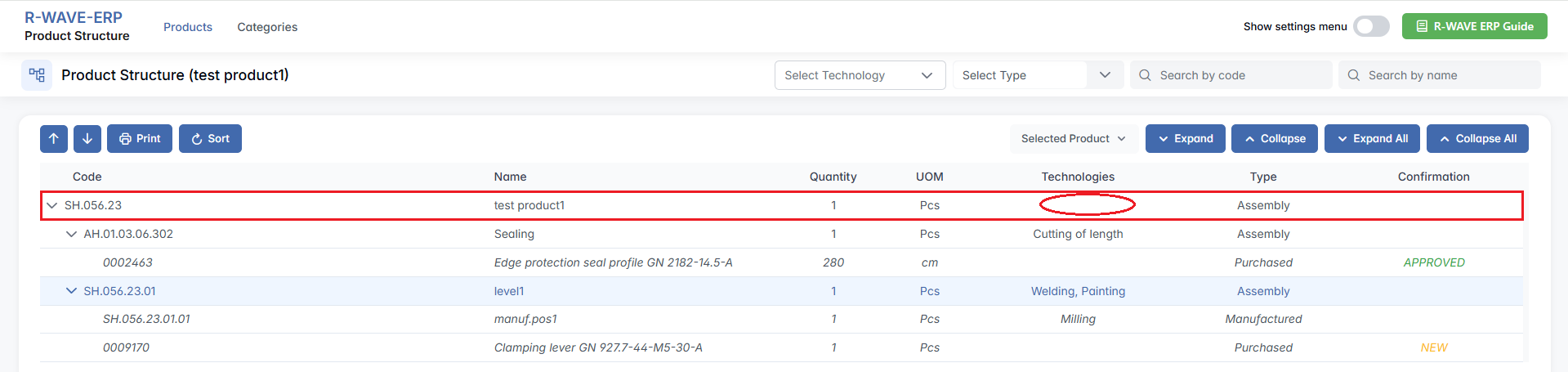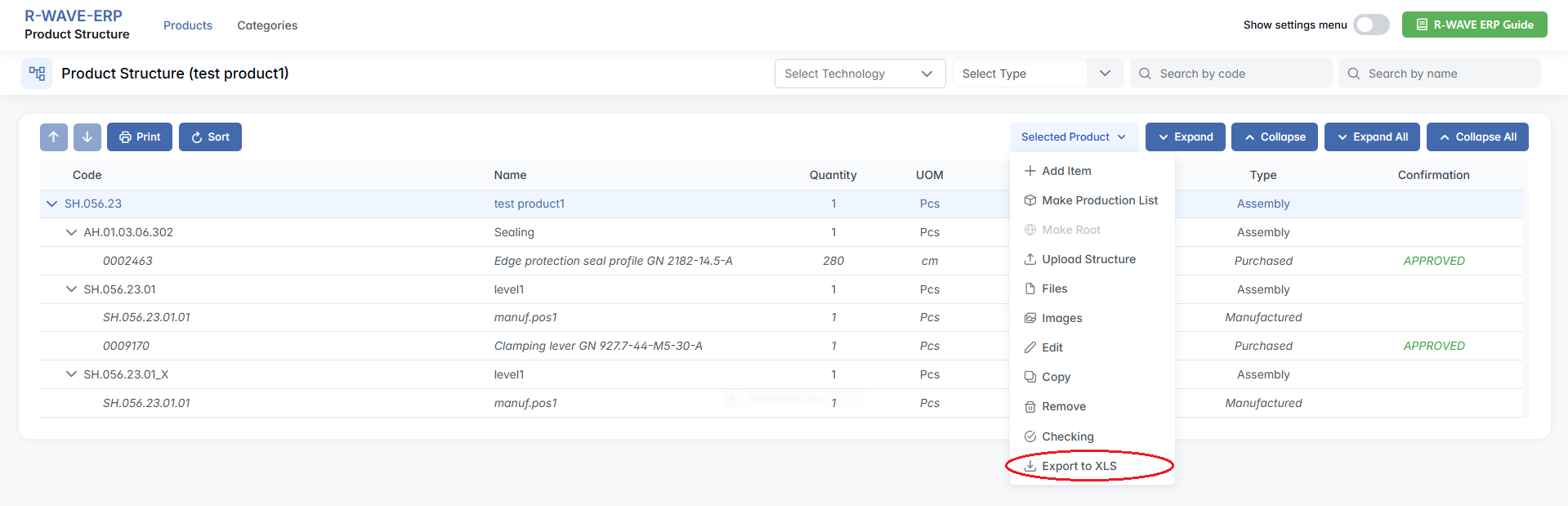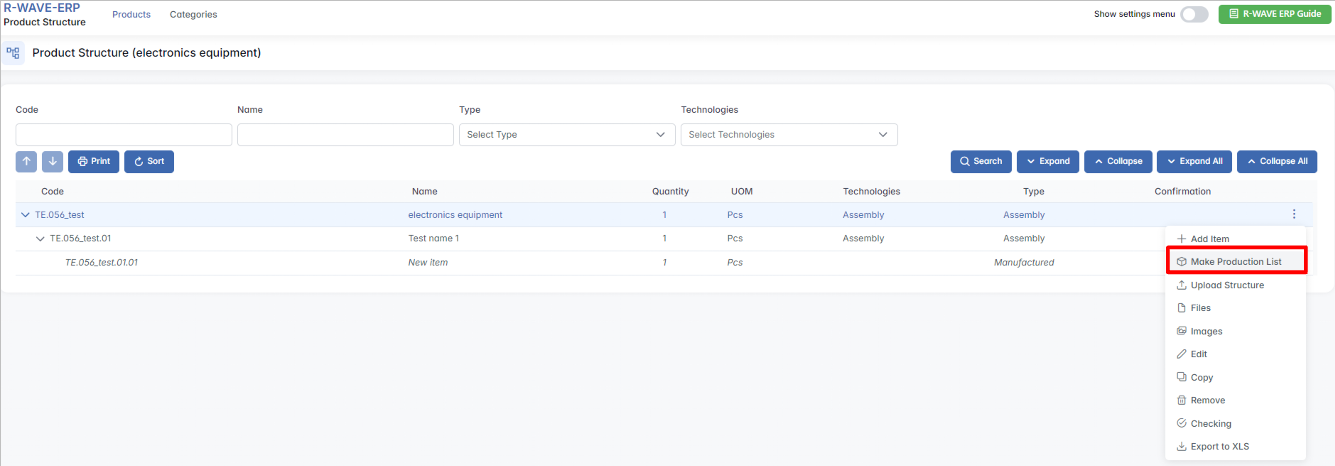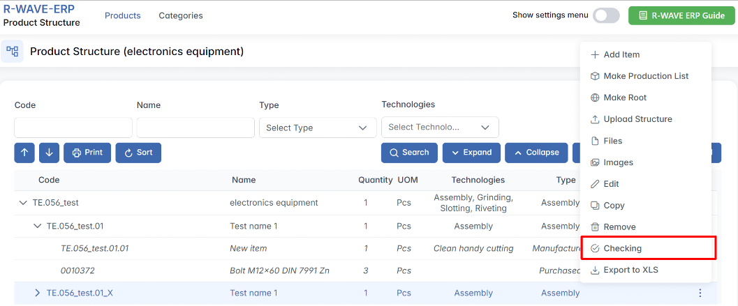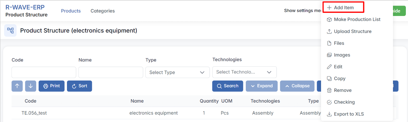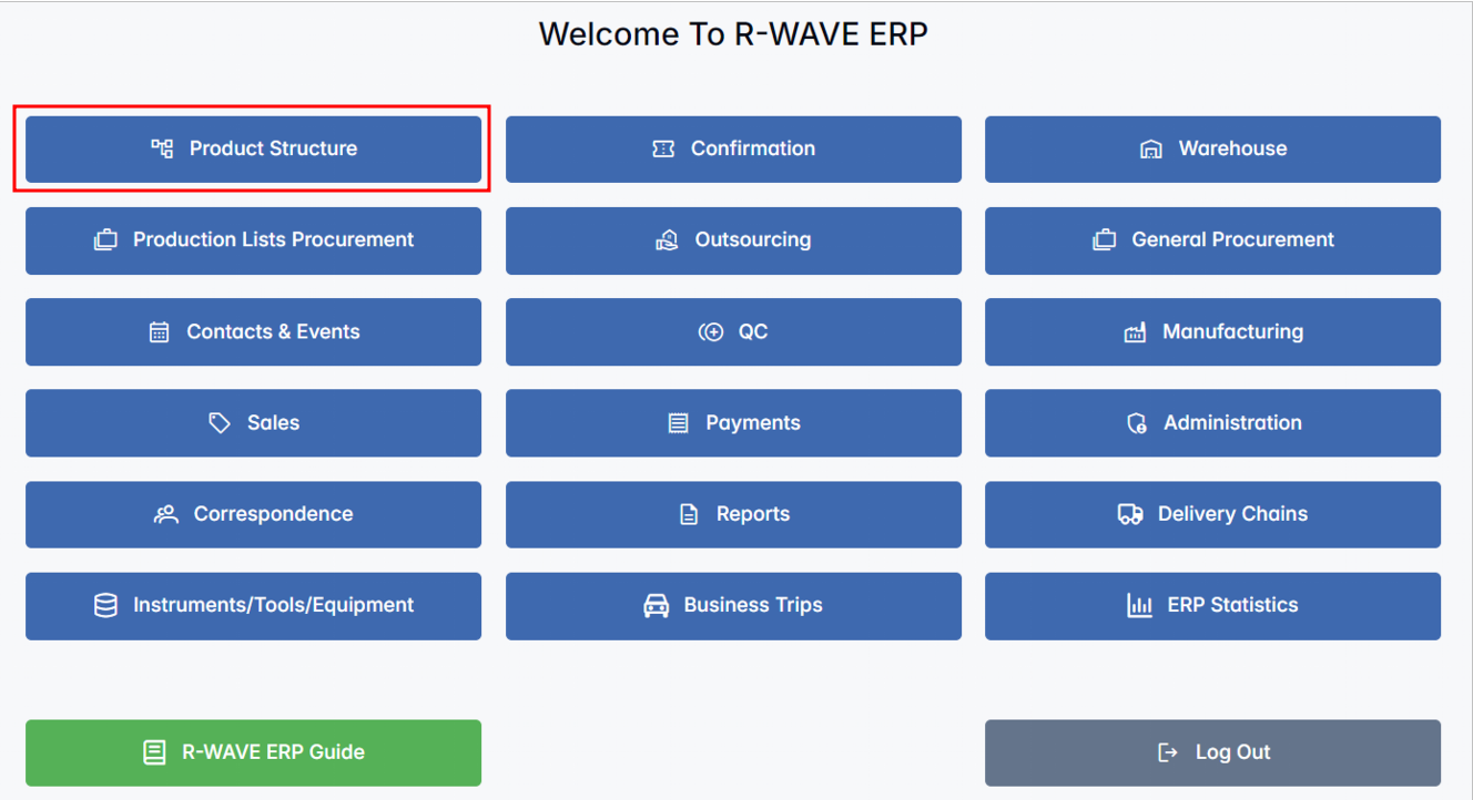 The Product Structure module in R-Wave ERP is designed to help companies define and manage the hierarchical structure of their products. This structure reflects the full breakdown of components, assemblies, and technological operations required to manufacture a final item. By using this module, users can build multi-level product structures, track the flow of production steps, and ensure that all necessary parts and processes are defined before production begins. Whether components are purchased, manufactured, or assembled, this module supports precise planning and seamless integration with other areas like Technologies, Warehouse, and Production Lists.