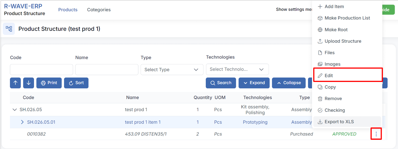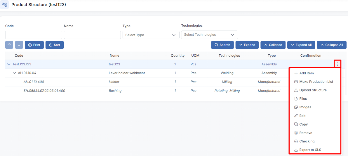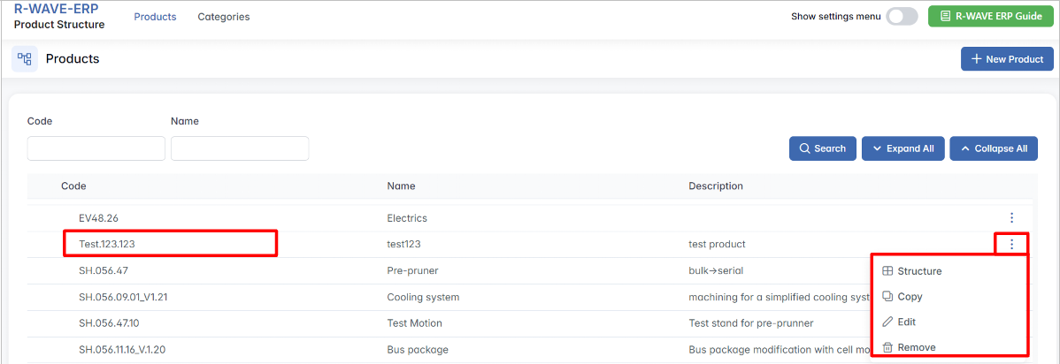 Once the Product Structure module is opened and the list of existing products is displayed, users can interact with individual products by using the contextual three-dot menu located on the right side of each row. To view or manage a product’s structure: