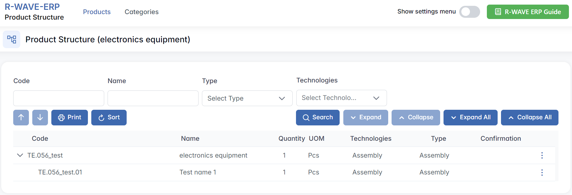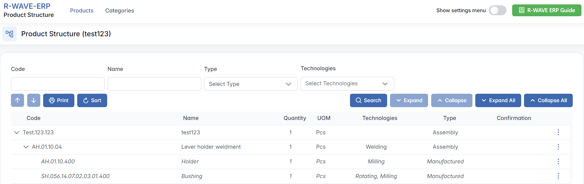 The Product Structure module in R-Wave ERP allows users to define and manage the hierarchical structure of any product that needs to be manufactured. This structure, commonly referred to as a Bill of Materials (BoM), outlines all components, assemblies, and production operations required to build a finished item.