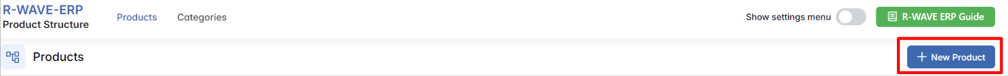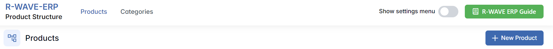 - + New Product - opens a form to create a new product entry and begin building its structure.