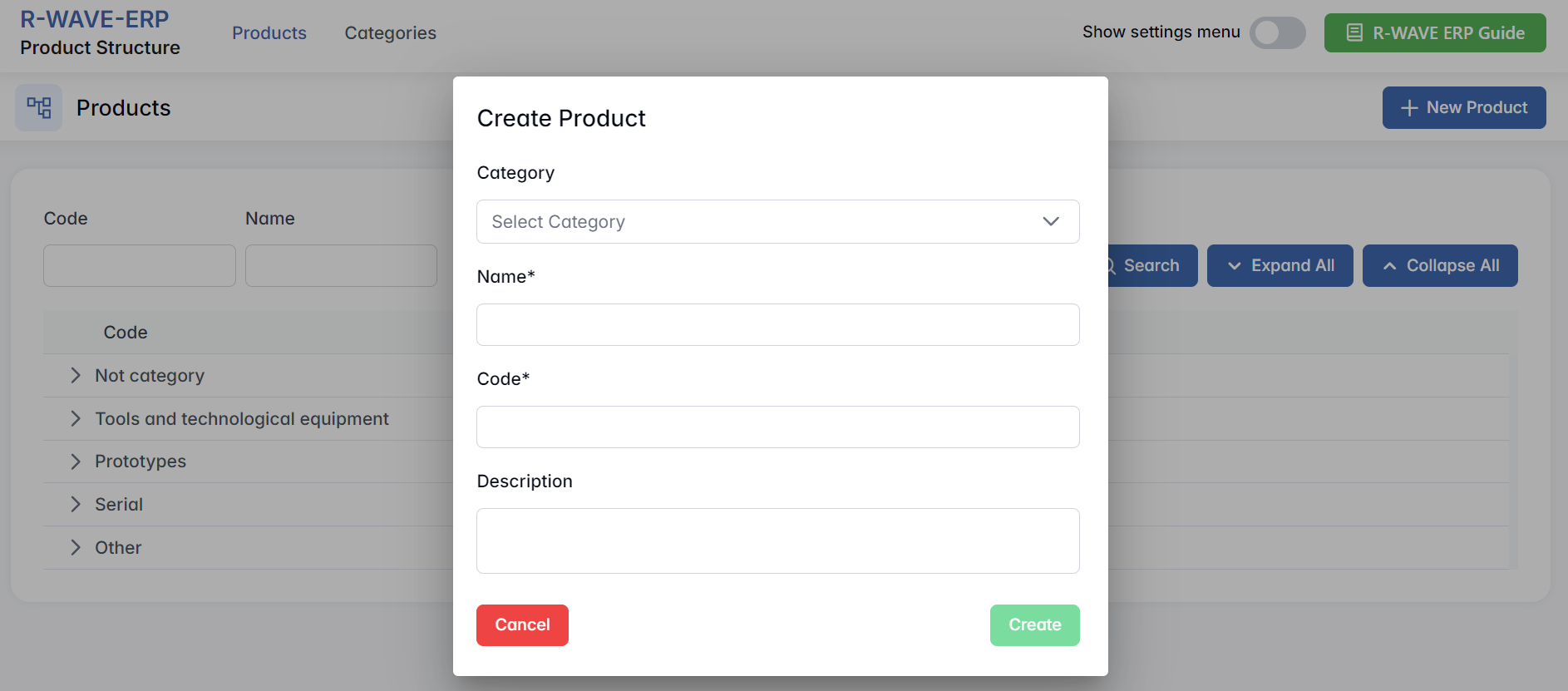 To build or expand the hierarchical classification system for your products, use the Create Product Structure feature in the Categories tab. This allows you to define new parent or subcategories that can later be assigned to individual products. Well-defined categories help with filtering, reporting, and organizing complex product portfolios in a scalable way.