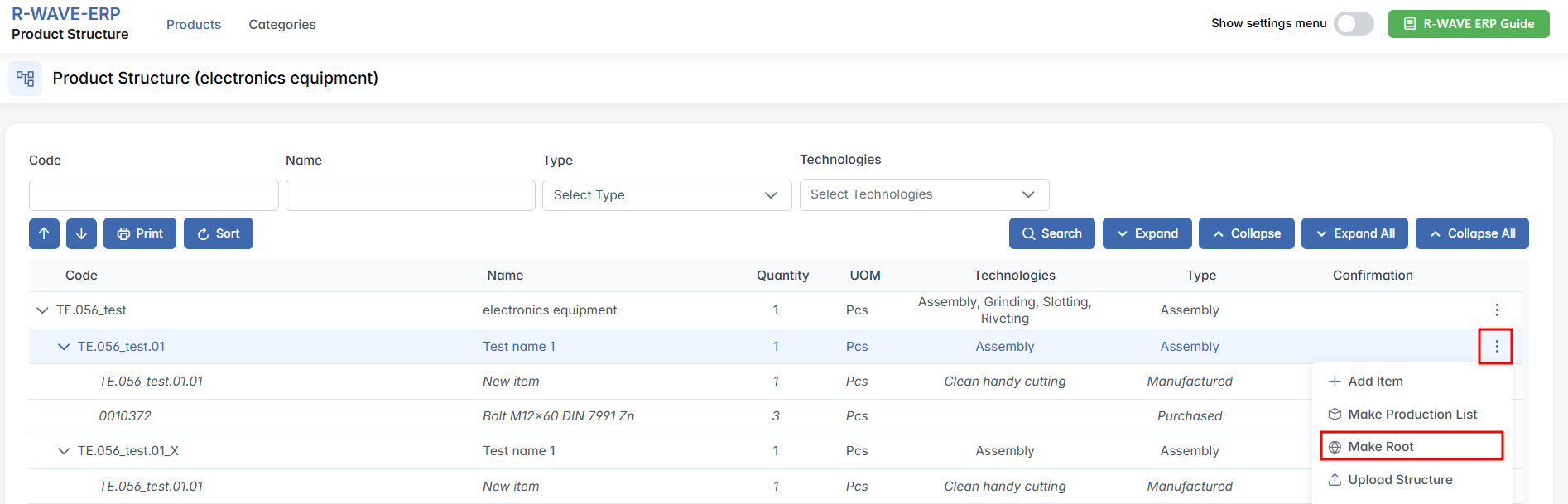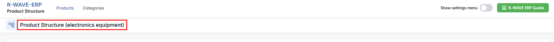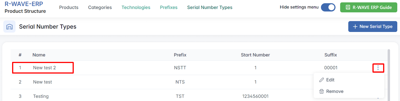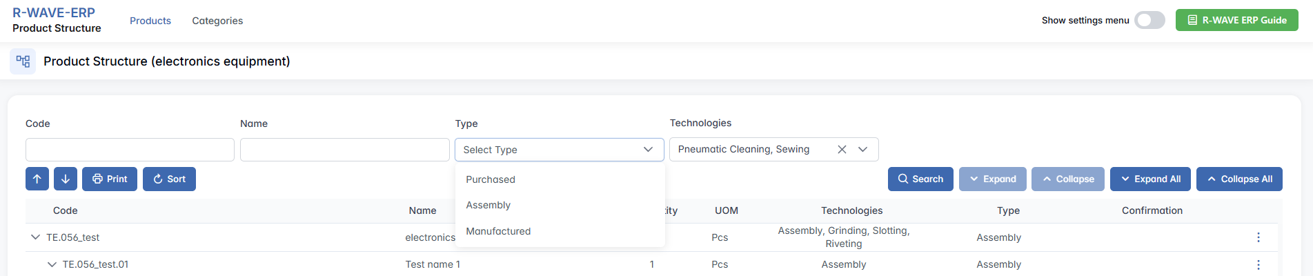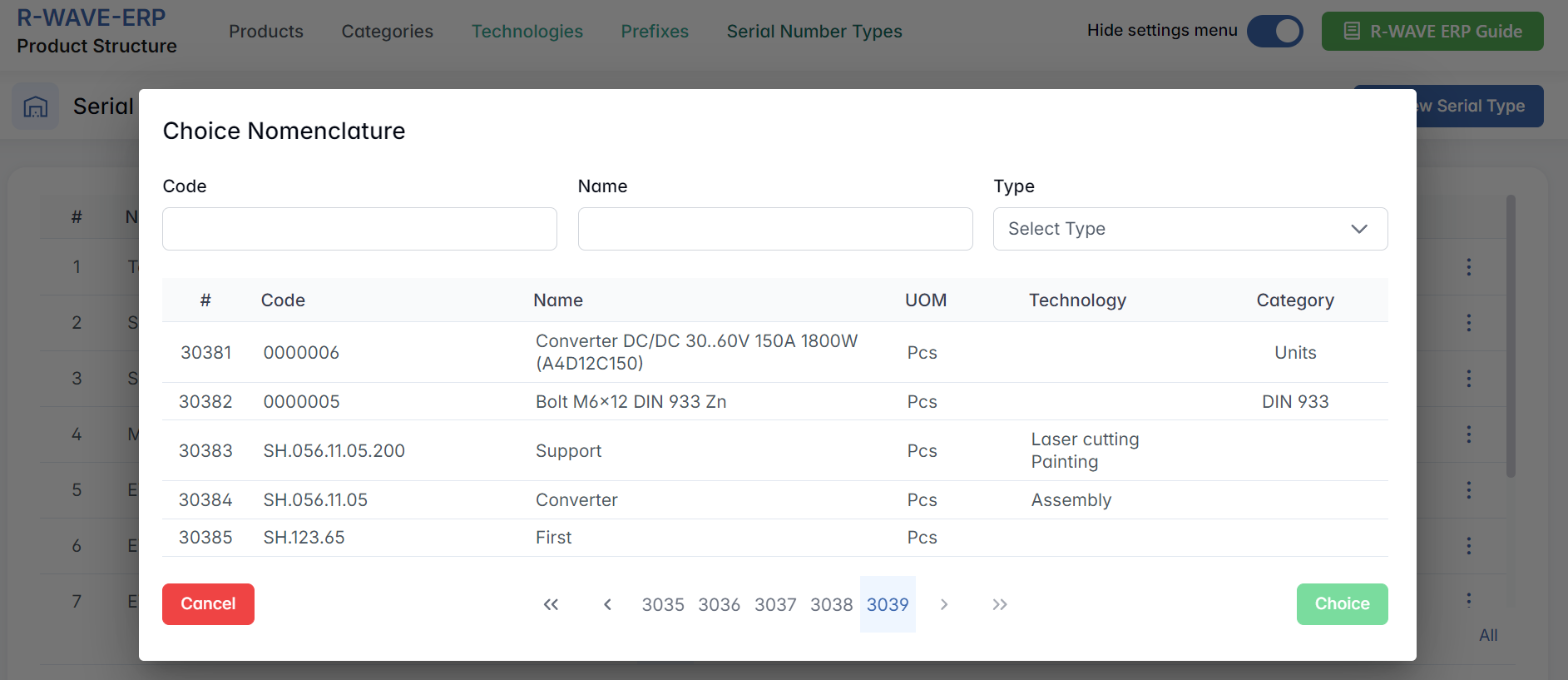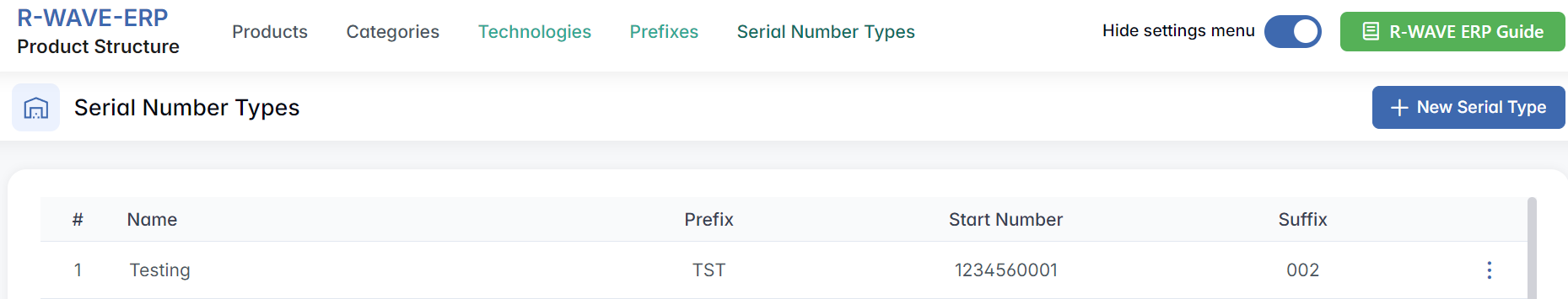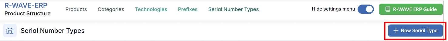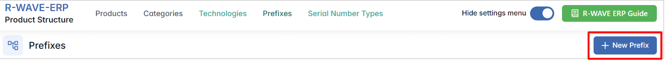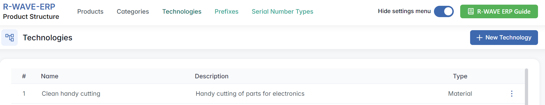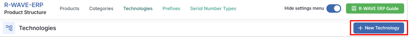 To support deeper configuration and better standardization of your manufacturing logic, the Product Structure module in R-Wave ERP includes a hidden settings menu. This page allows you to manage critical reference data: Technologies, Prefixes, and Serial Number Types - all of which are used when creating or importing complex product structures.