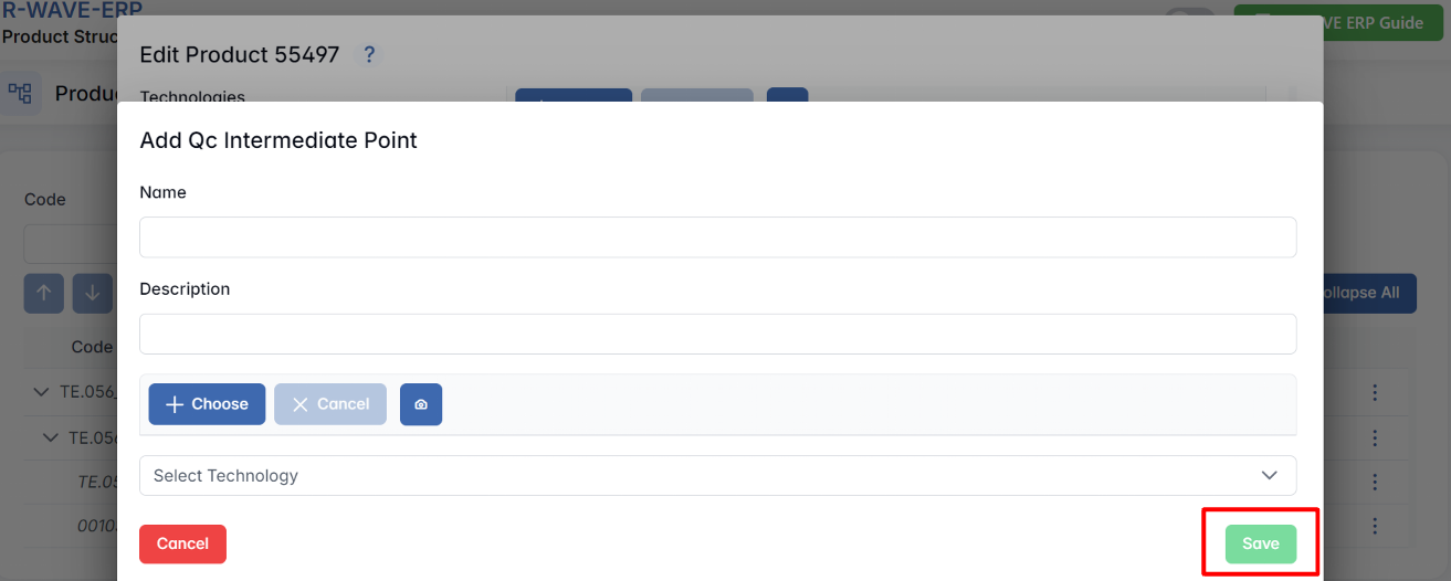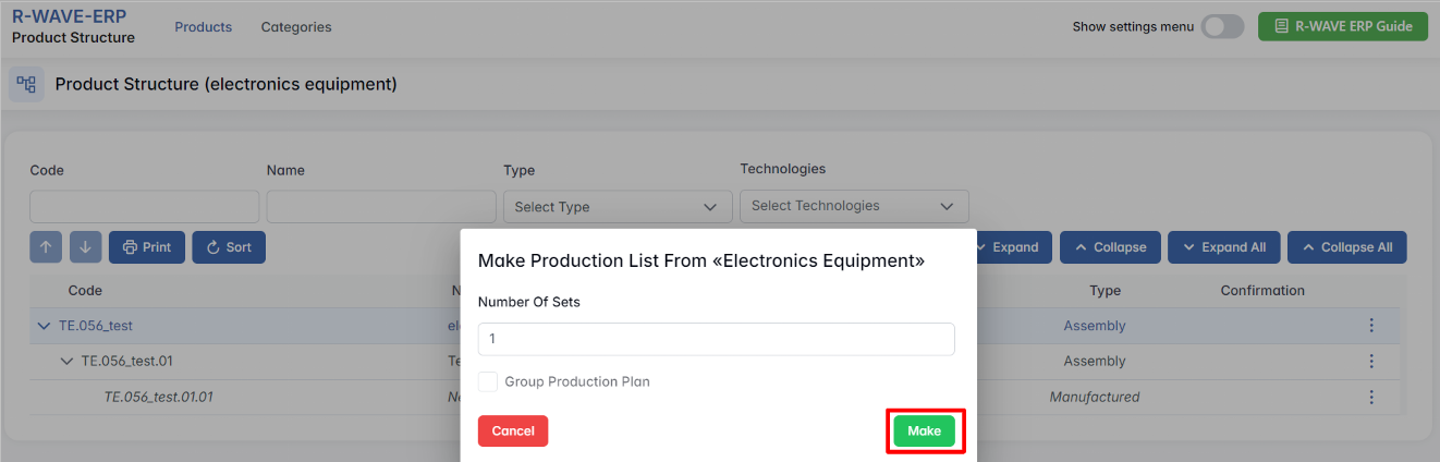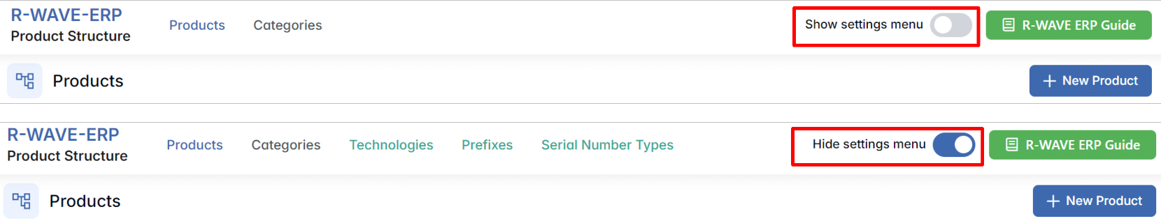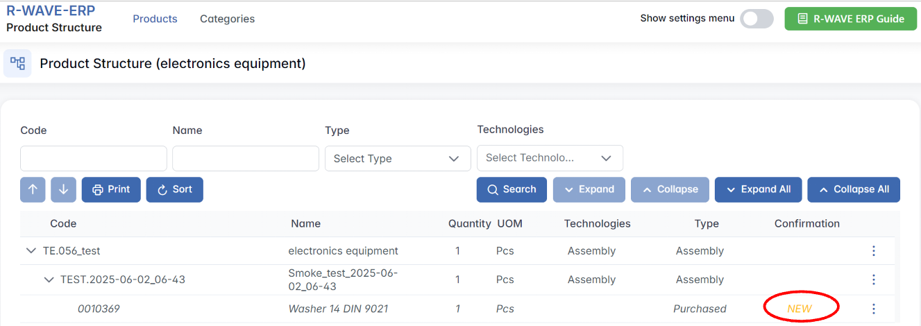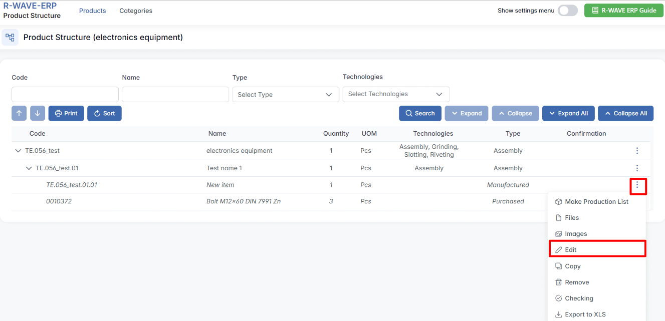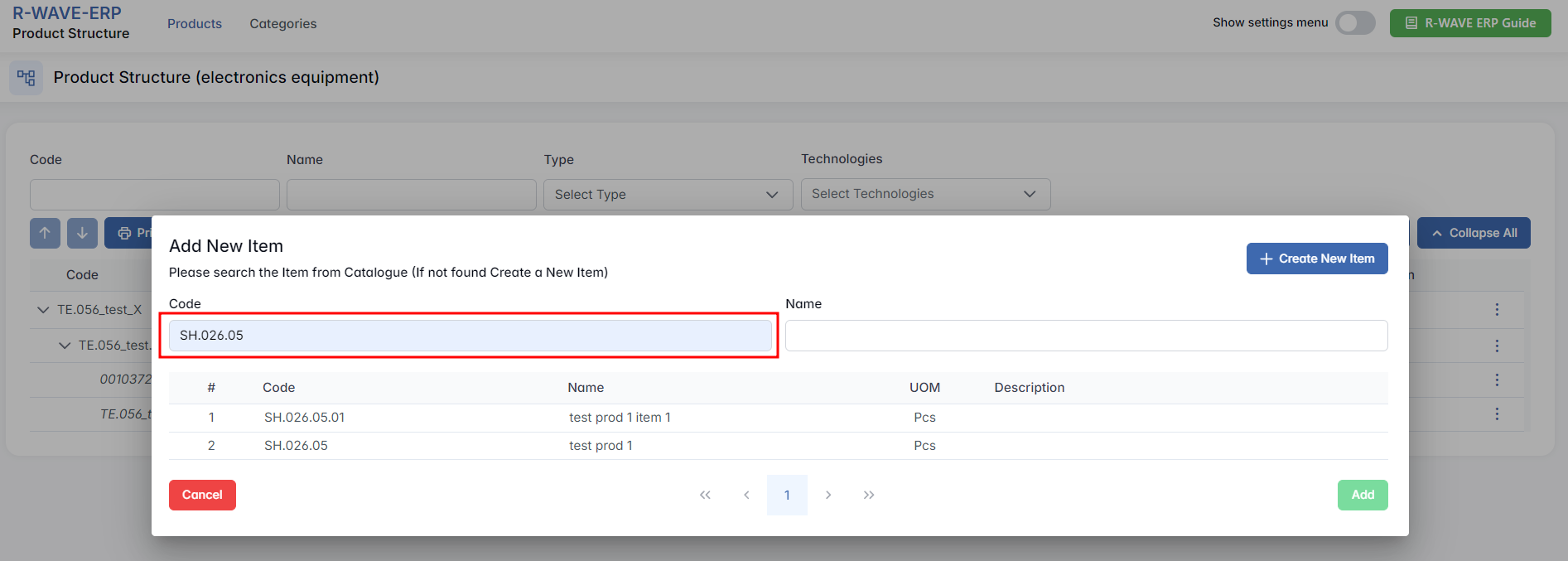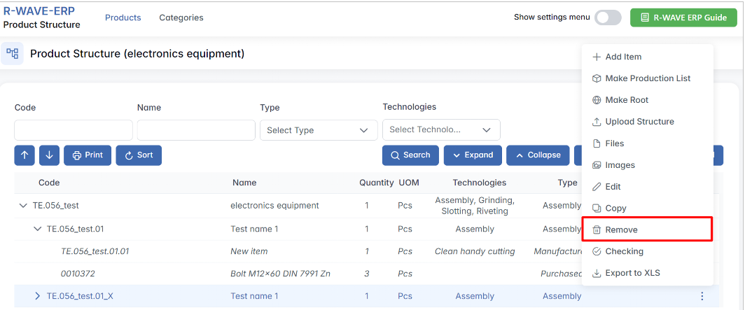 To support deeper configuration and better standardization of your manufacturing logic, the Product Structure module in R-Wave ERP includes a hidden settings menu. This page allows you to manage critical reference data: Technologies, Prefixes, and Serial Number Types - all of which are used when creating or importing complex product structures.