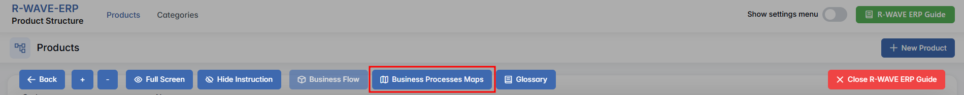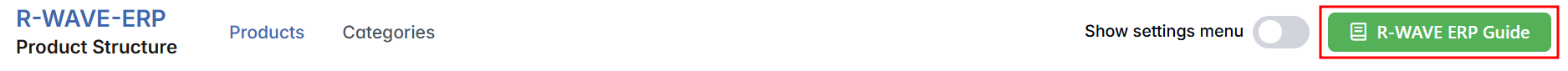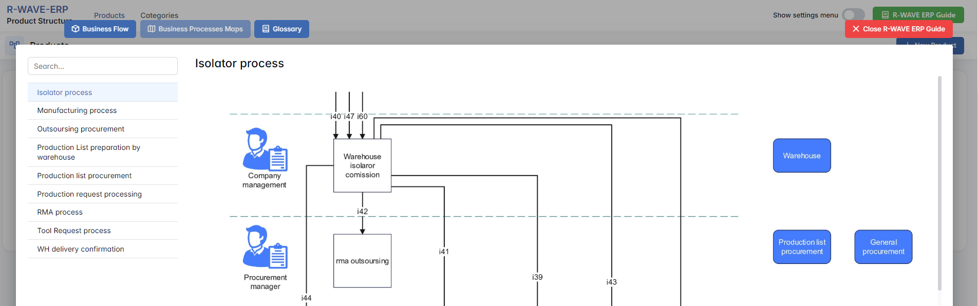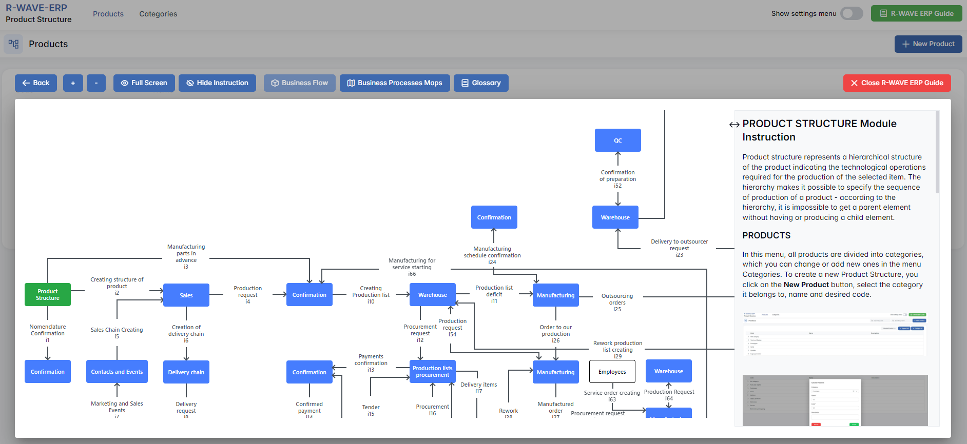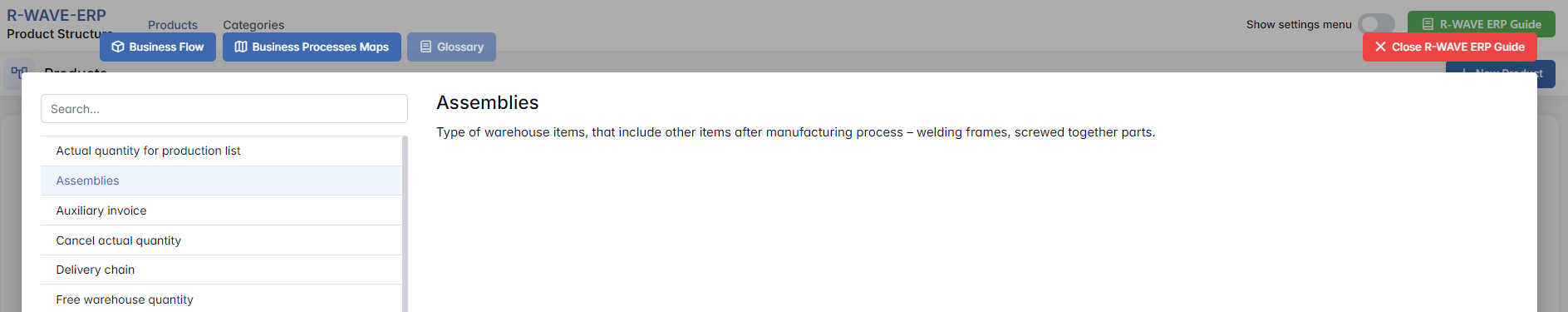 To support user navigation and clarity, R-Wave ERP includes a built-in contextual help system in the form of a pop-up guide window. This feature is available across different modules, including Product Structure, and is designed to help users understand where they are in the system and how to use the current section effectively.