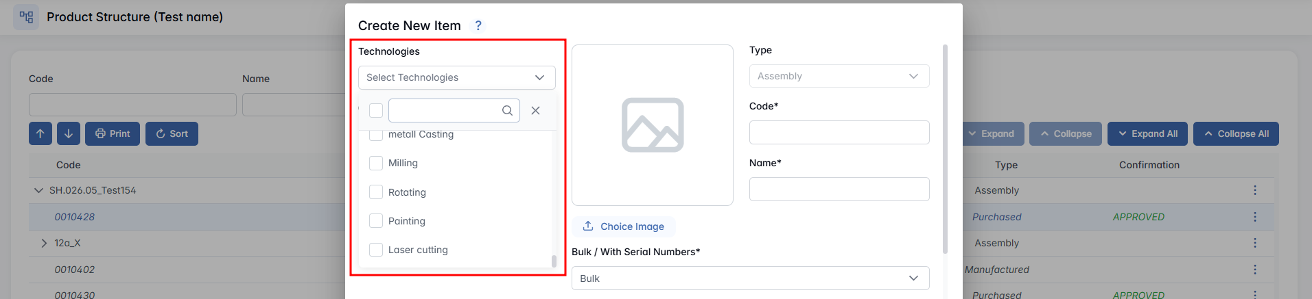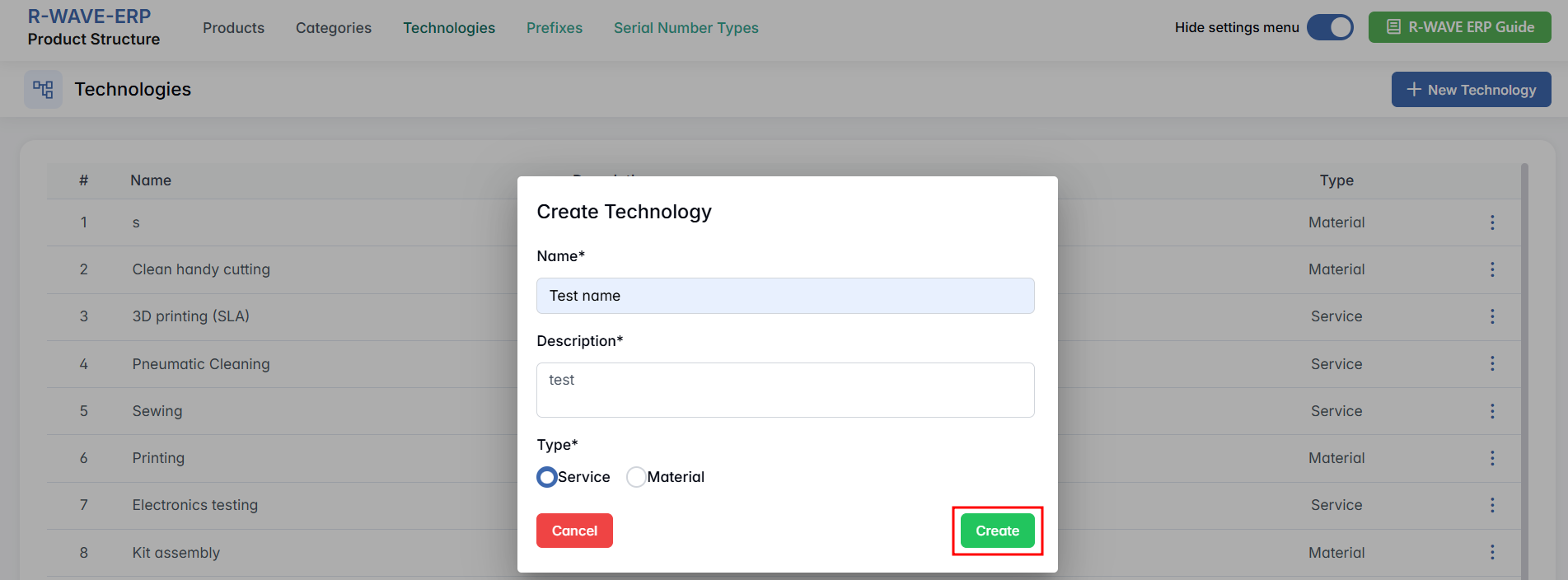 Technologies define production operations required for manufacturing components and assemblies (e.g., welding, laser cutting, 3D printing). Each technology has a name, description, and a type - used to classify the operation as either a Service or Material-based process.