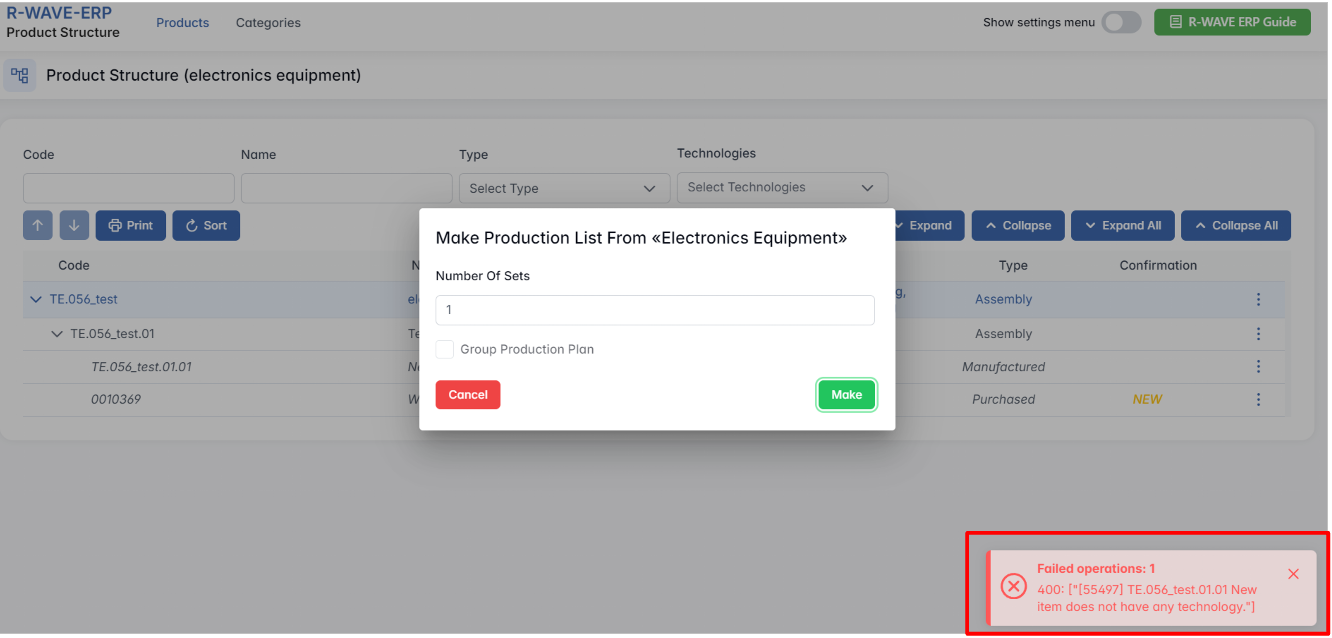 Technologies must be assigned to all manufactured and assembly positions before production can be initiated. The system will block production if any required step is missing.