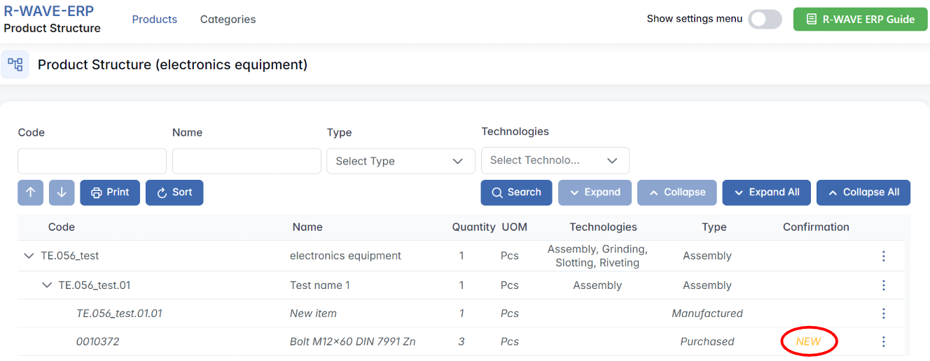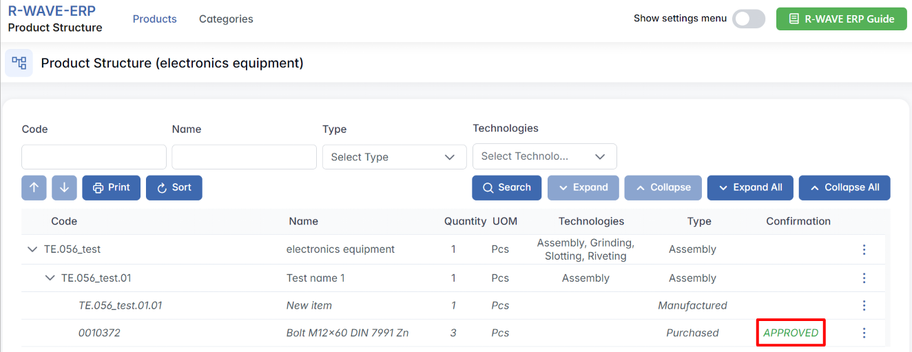 This hierarchical view allows you to see the subcomponents, making it easy to trace the full structure of any product at a glance.