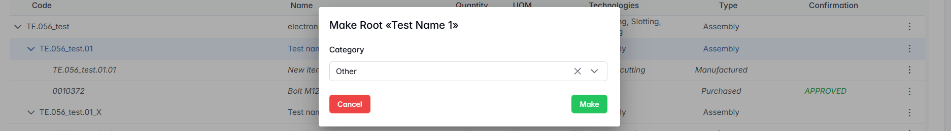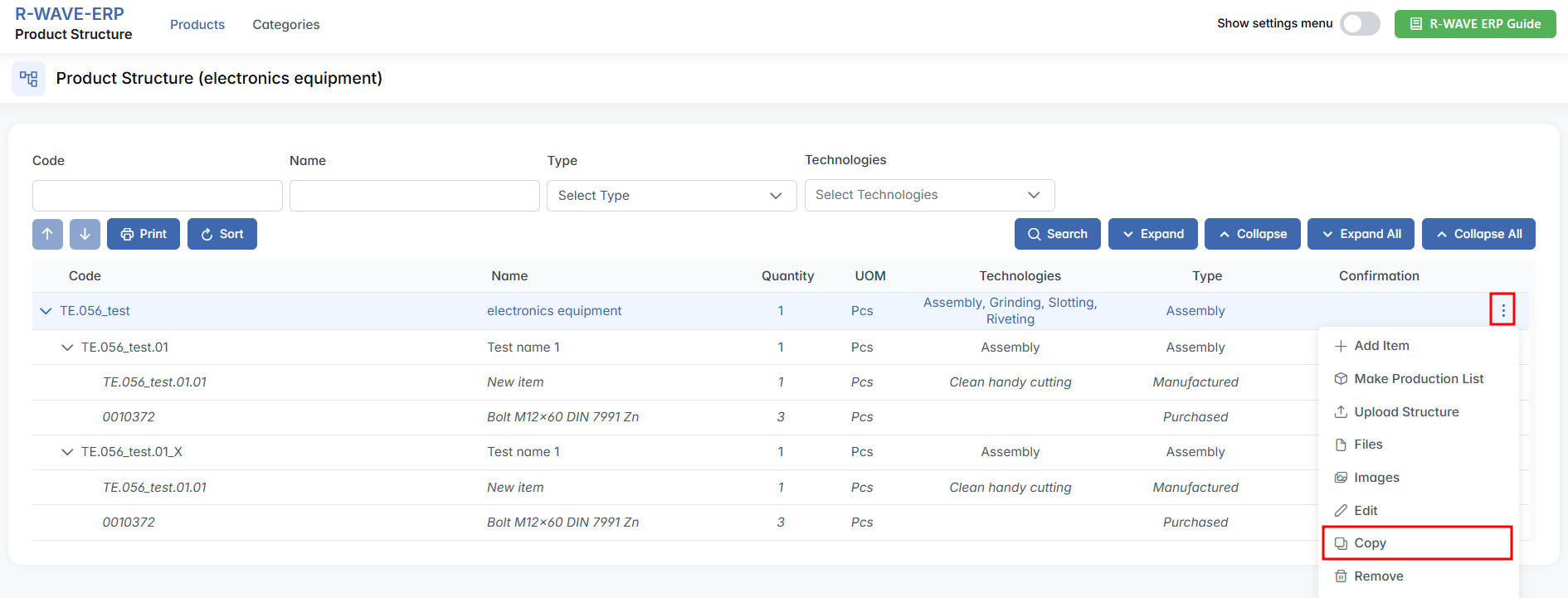 Opens the detailed hierarchical structure of the selected product. Here, you can view its full Bill of Materials (BoM), including assemblies, manufactured parts, and purchased components. From this view, you can begin building or editing the component tree. - Copy