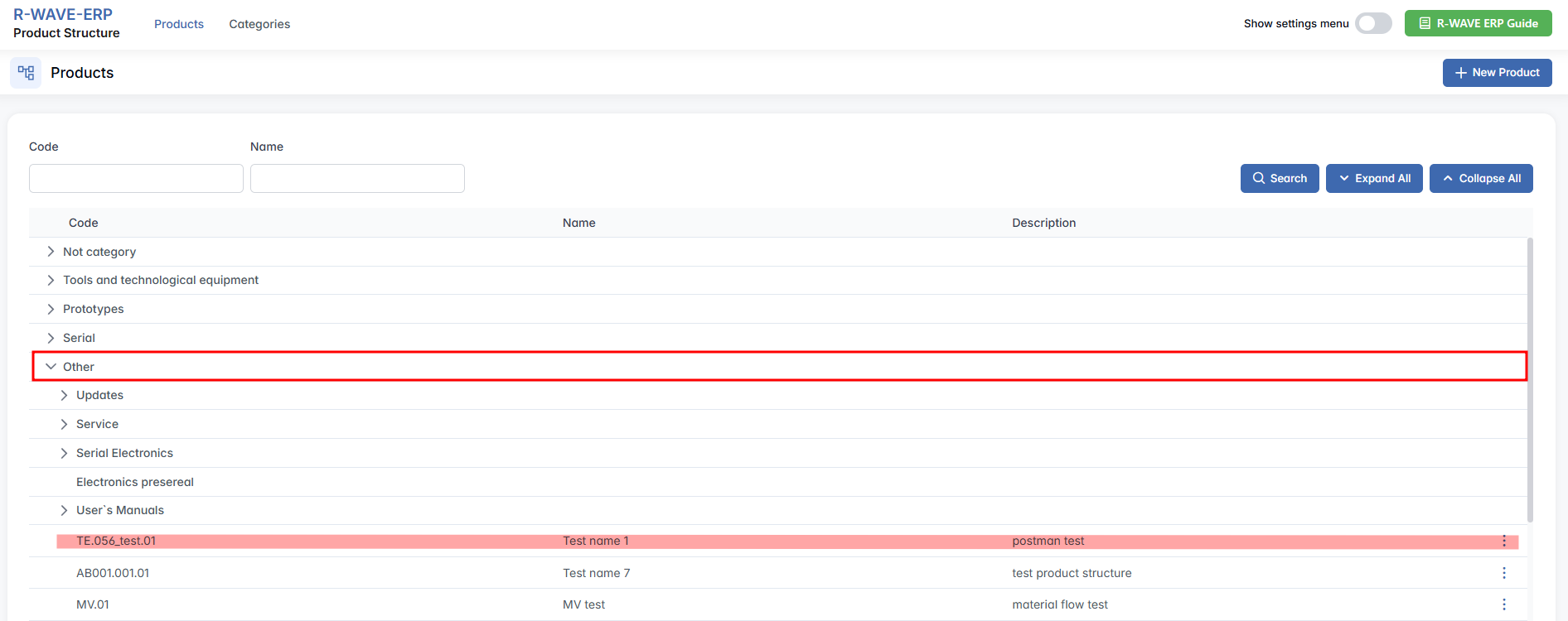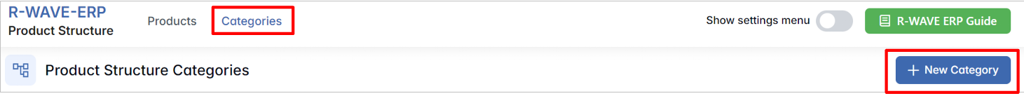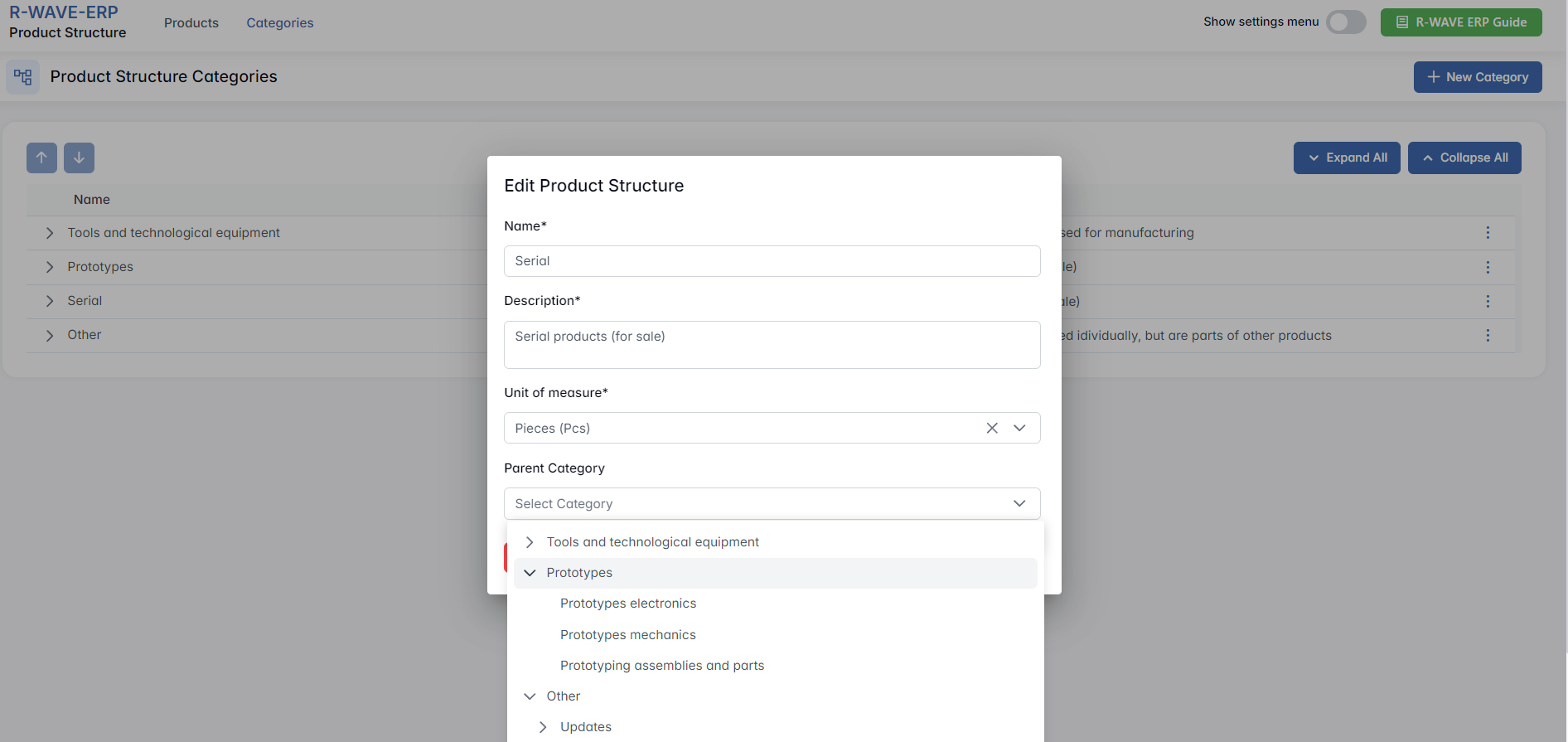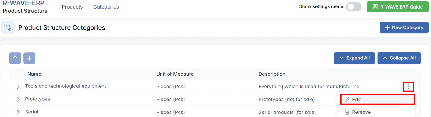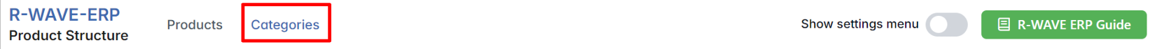 In R-Wave ERP, product categories define how items are grouped, filtered, and managed within the system. You can edit a category - whether it’s a main category or a subcategory - in two ways: directly from the Products tab or via the Categories tab.