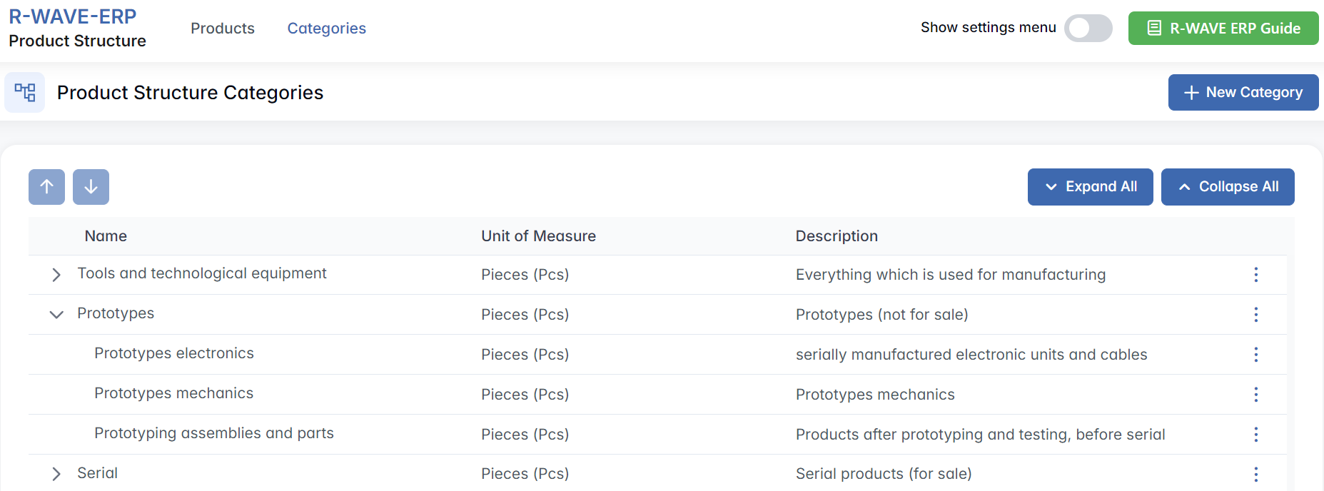 The Categories tab in the Product Structure module allows you to manage the hierarchical organization of product categories. Unlike the Products tab, this page does not display individual items - it focuses solely on how categories and subcategories are structured, grouped, and maintained.