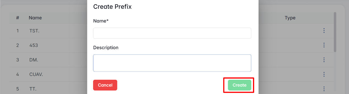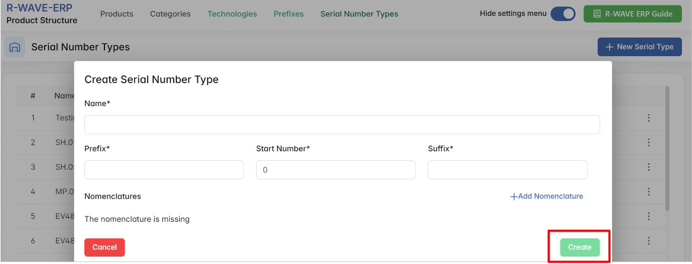 In the pop-up Create Serial Number Type, enter: Name, Prefix, Start Number, Suffix