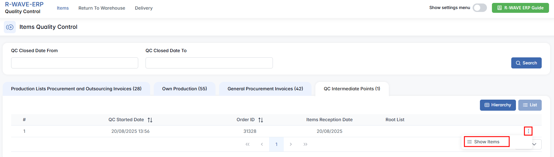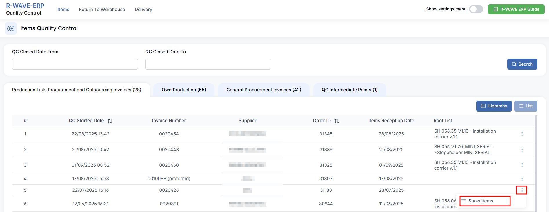 As with other sections of the QC module, the interface provides structured access to incoming records. Each row in the list includes key details such as the QC start date, invoice number, order ID, supplier, reception date, and the associated root list. You can use the toggle buttons on the right side — Items, Expand All, Collapse All, Hierarchy/List View — to adjust how the information is displayed.