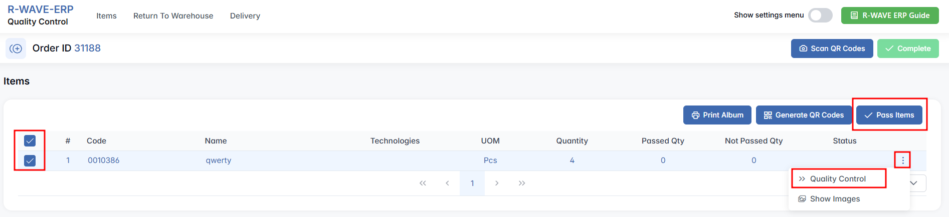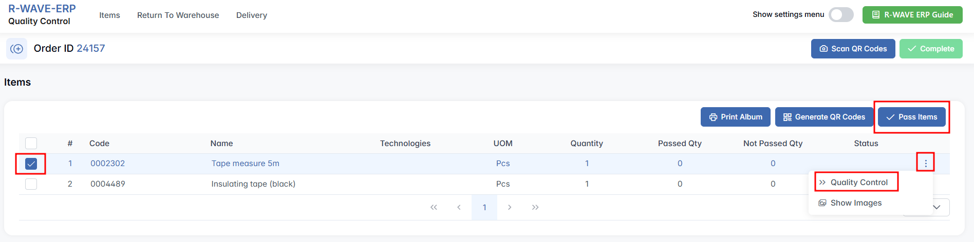 Begin by selecting the item(s) via checkboxes, click three-dot menu and press Quality Control, input the results in the pop-up window (number of passed and not passed units), and press Save. If all selected items have passed quality control, click the Pass Items button to mark them as passed. This allows you to skip logging each item manually.