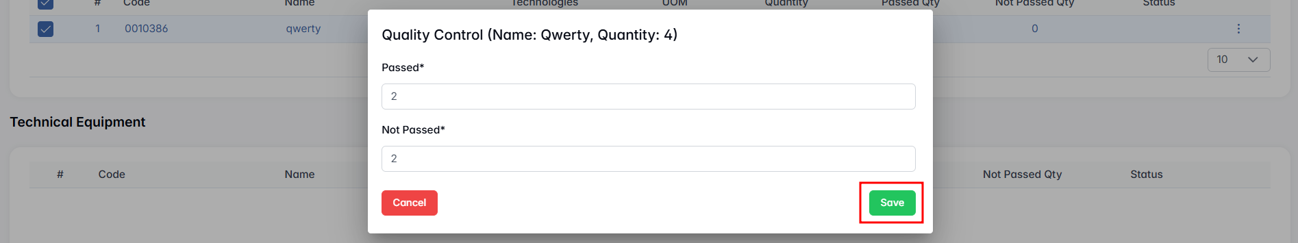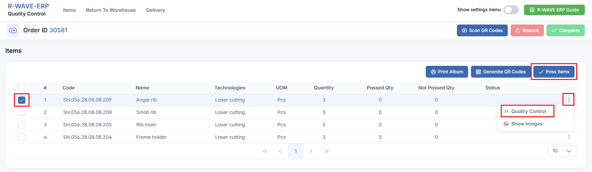 Just like in the previous section, each item is shown with its product code, name, manufacturing technology, unit of measure, total quantity, as well as the fields for passed and not passed quantities. Use the checkboxes to select items, click three-dot menu and press Quality Control, input the inspection results, and press Save. If all selected items have passed quality control, click the Pass Items button to mark them as passed. This allows you to skip logging each item manually.