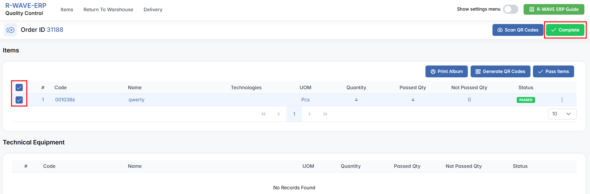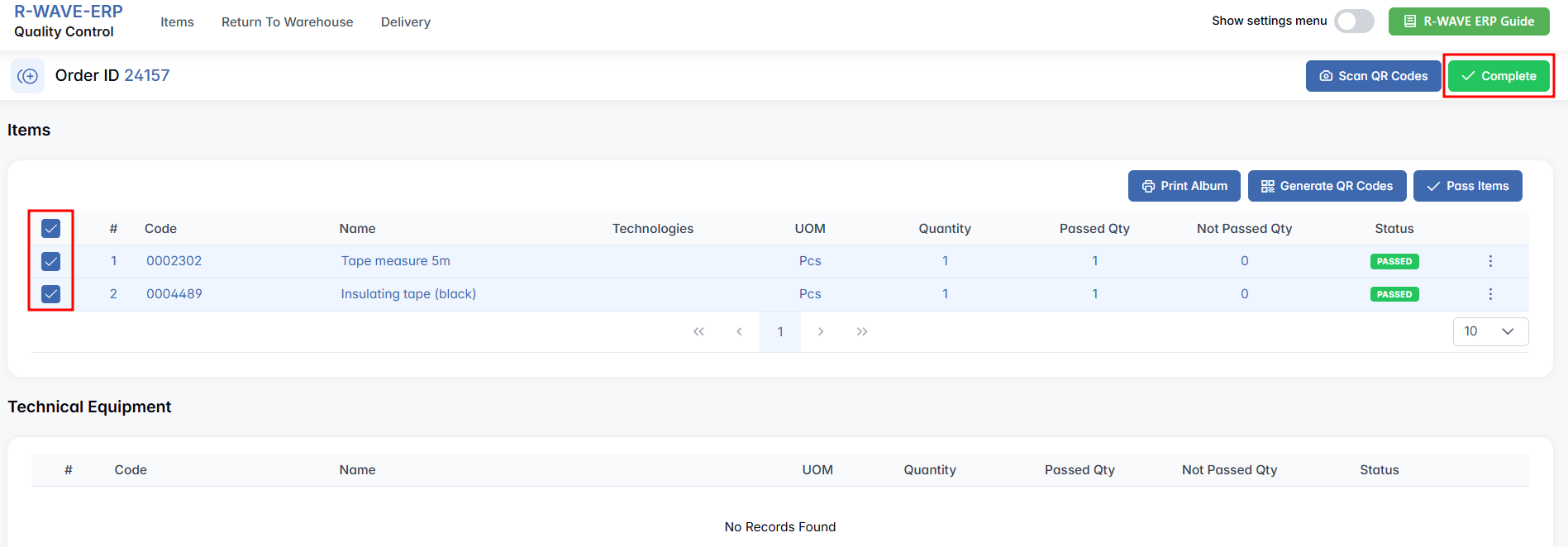 Additionally, in this tab, you may see entries related to Technical Equipment. If such items are present, they will appear in a dedicated section below the list. You can perform quality control on these items using the same logic and buttons as described above.