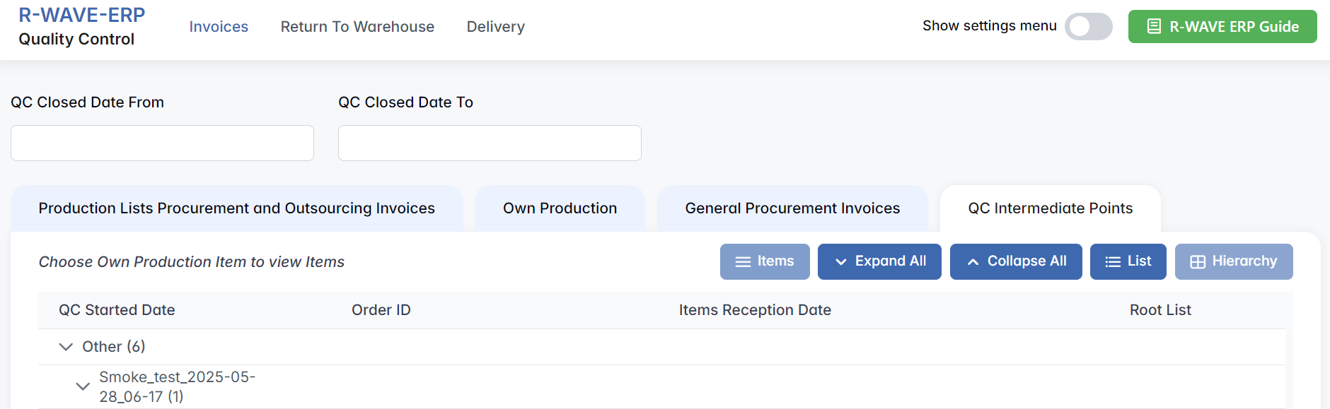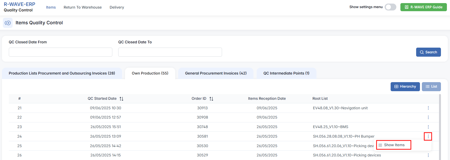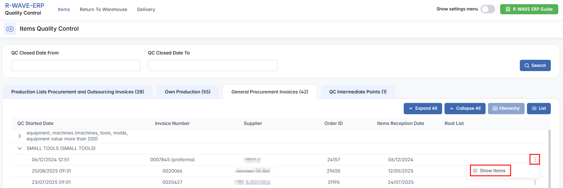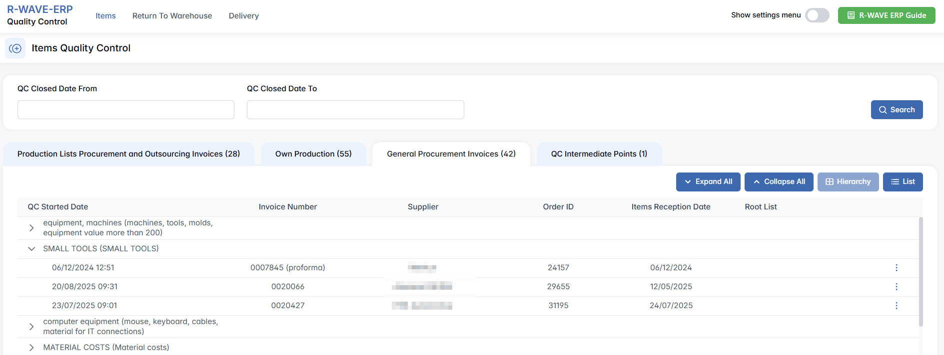 Production Lists Procurement and Outsourcing Invoices — covers quality control for externally sourced materials and outsourced production. This tab handles quality control of items purchased externally for production needs or acquired through outsourcing agreements. This includes materials, components, or assemblies that are not produced in-house but are essential for manufacturing processes. These items enter the QC workflow once the corresponding procurement invoice has been completed in the system. This tab displays QC tasks related to external procurement in a structured format. You can view the list in Hierarchy mode (for category-based grouping) or List mode (for a flat overview) using the buttons on the top right. Regardless of view, each entry includes key details such as the QC start date, invoice number, supplier, order ID, reception date, and the related root list (i.e., the parent product or structure).