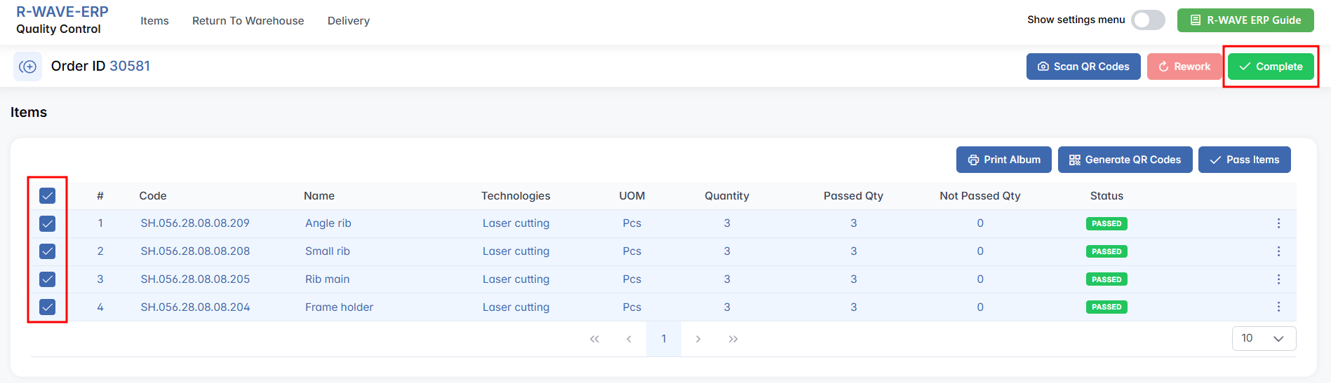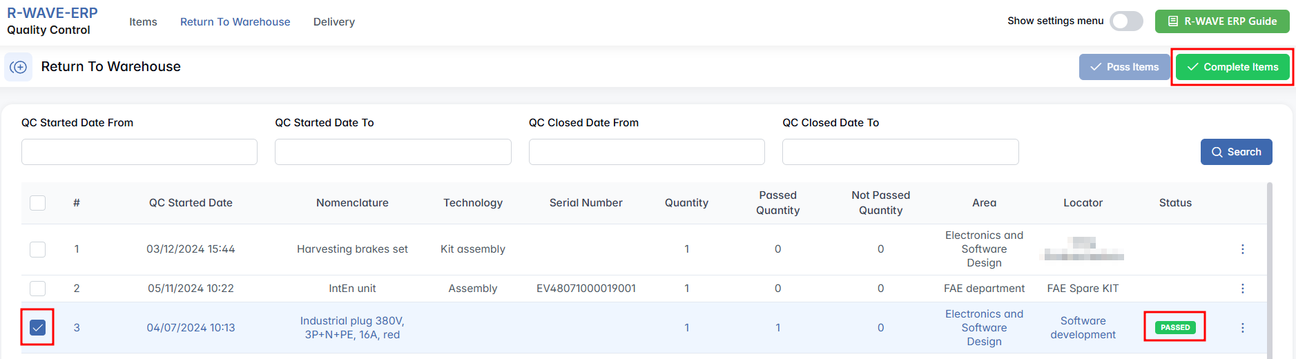 Once you have entered all necessary information, complete the process by pressing the green Complete button. Approved items will be moved to Warehouse > QC Warehouse, while failed ones will be redirected to Warehouse > Isolator for further action.