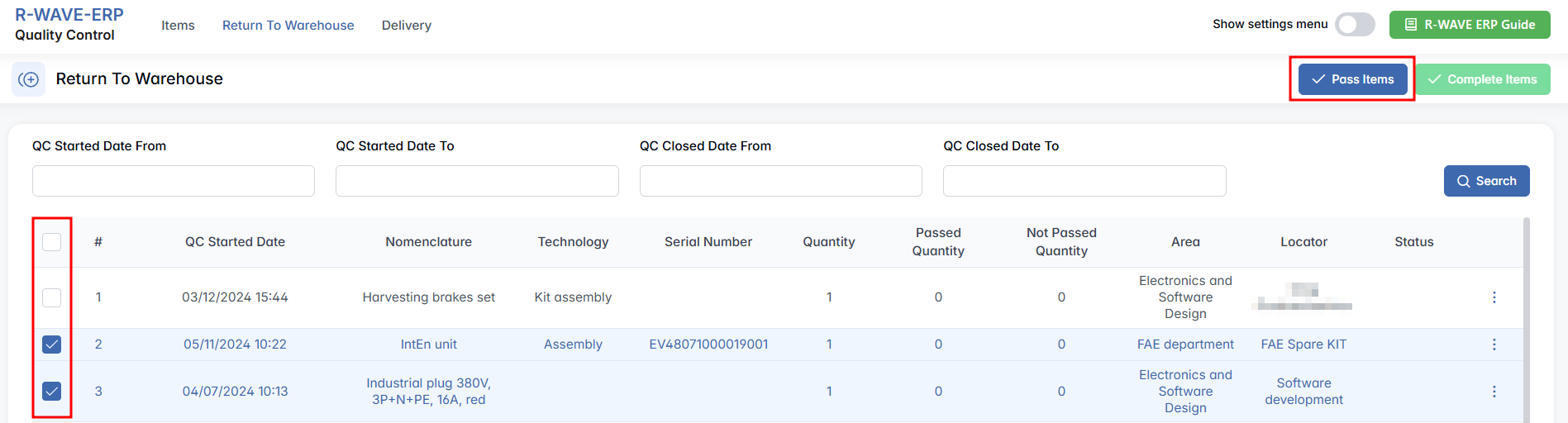 To perform a quality check, begin by ticking the checkbox next to the item(s) you want to evaluate. Then click on the Quality Control button. If all selected items have passed quality control, click the Pass Items button to mark them as passed. This allows you to skip logging each item manually.
