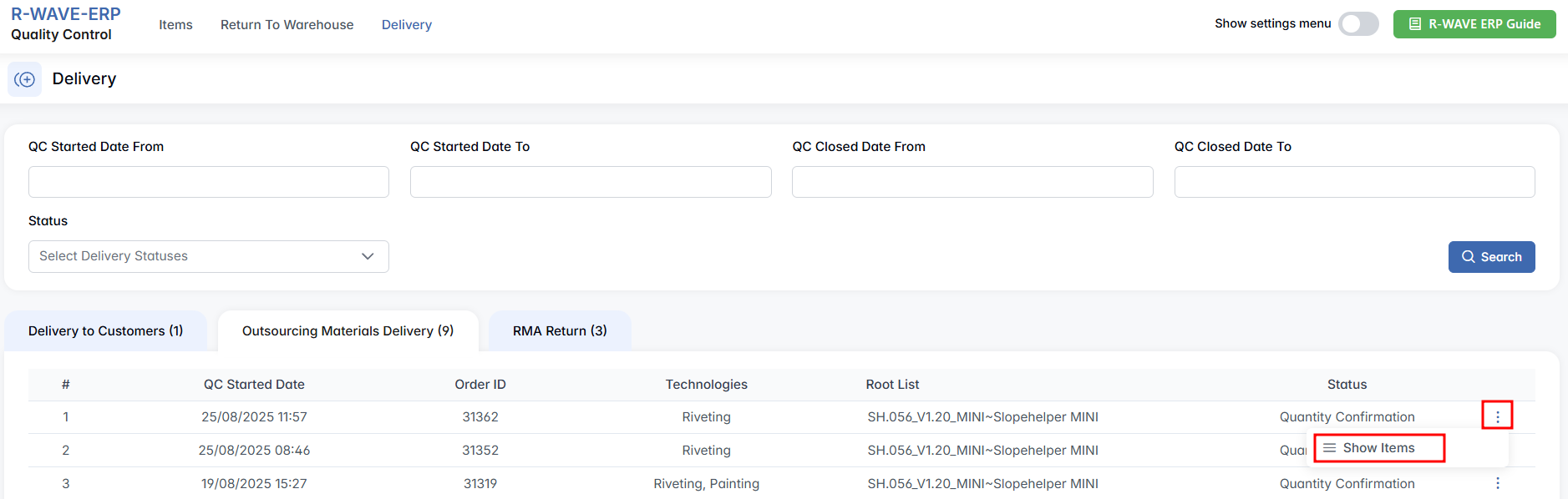 The Delivery tab of the Quality Control (QC) module is dedicated to handling items that are being delivered out of the organization — whether to a customer, a subcontractor, or for return via RMA (Return Merchandise Authorization). This part of the module ensures that all outgoing shipments are reviewed for completeness, accuracy, and packing compliance before they leave the warehouse.
