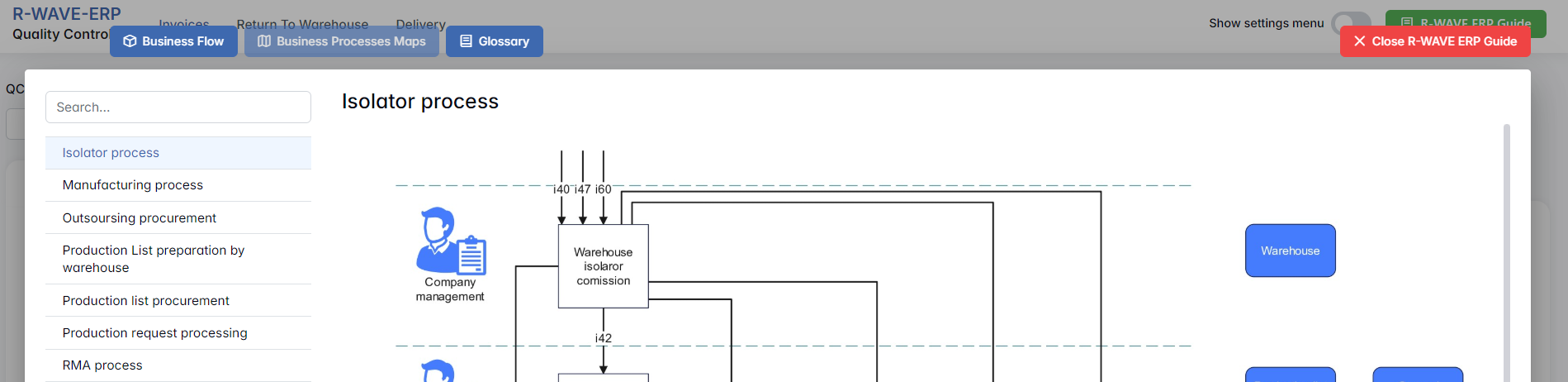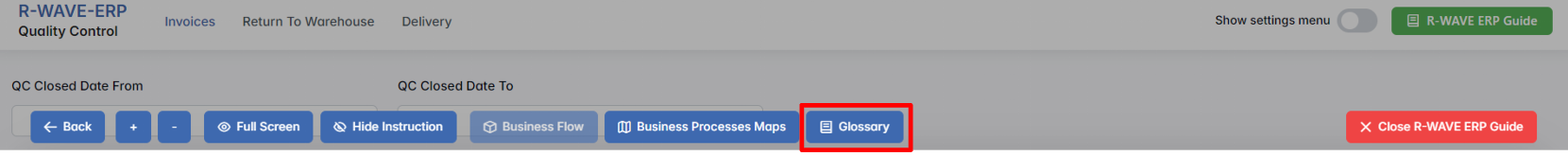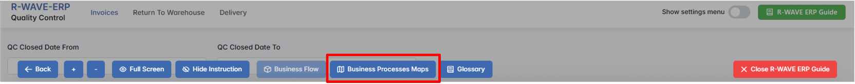 To support user navigation and clarity, R-Wave ERP includes a built-in contextual help system in the form of a pop-up guide window. This feature is available across different modules, including Quality Control, and is designed to help users understand where they are in the system and how to use the current section effectively.