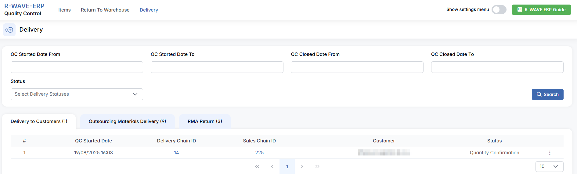 Note: Records in this section will appear only once a delivery for a customer order has been created and passed into the QC workflow. These deliveries usually originate from the sales or shipping departments and must follow internal logistics procedures to reach this step.