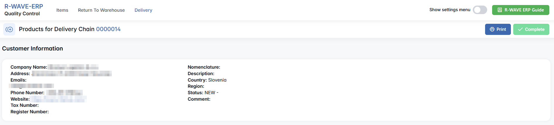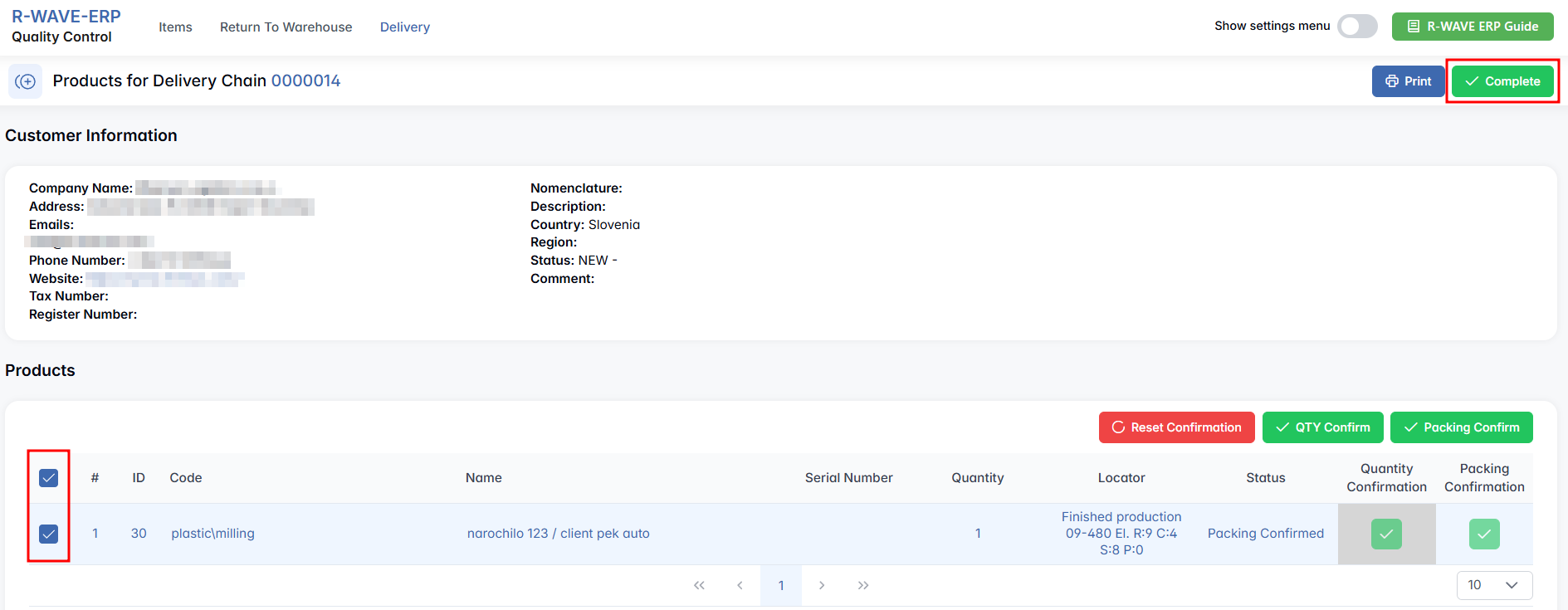 In the upper-right corner of the item list, you’ll also see several output and navigation options: Print and Complete — finalizes the delivery; this becomes active only once all items have both quantity and packing confirmed.