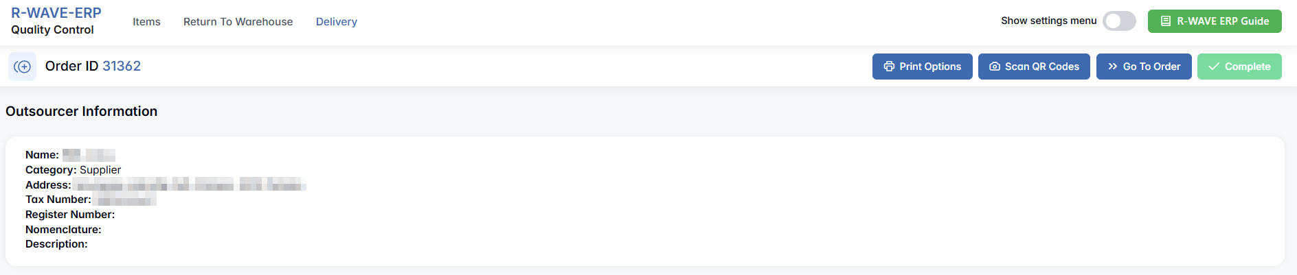 The QC module is divided into three main sections: Items, Return to Warehouse, and Delivery.
