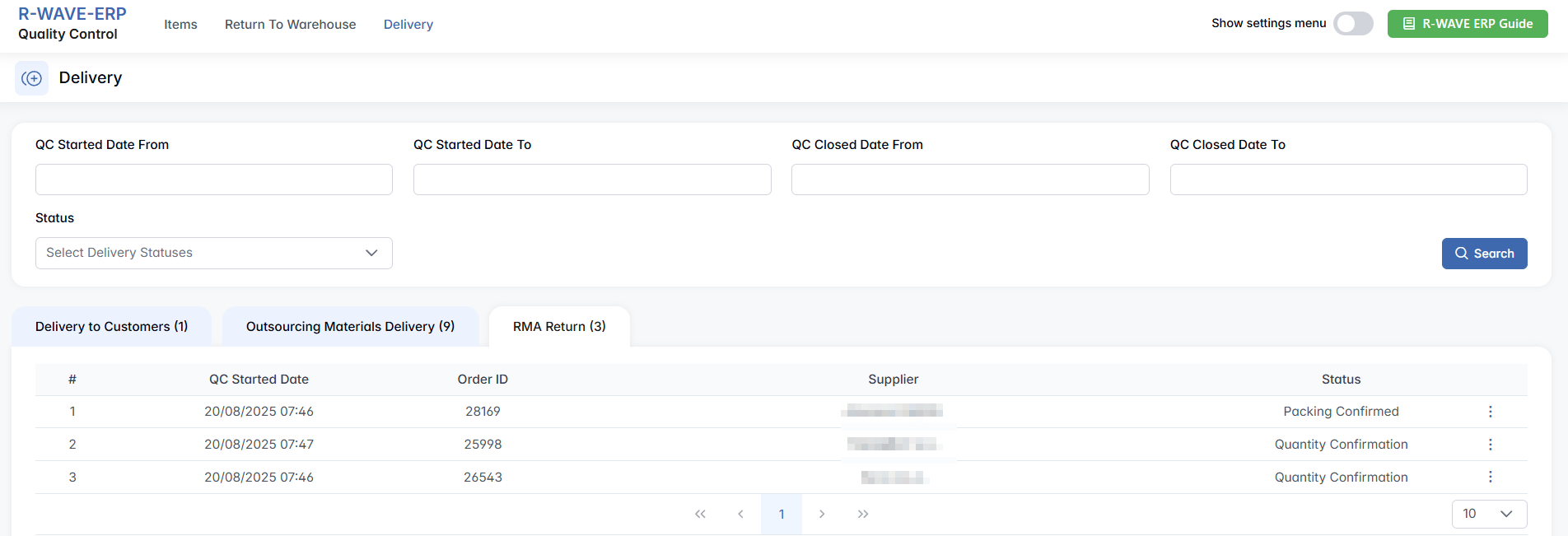 This subtab of the Delivery tab manages all quality-controlled returns under the Return Merchandise Authorization (RMA) process. It includes products that were received from suppliers but did not pass quality control, and are now being returned for refund, redelivery, or other resolution actions.