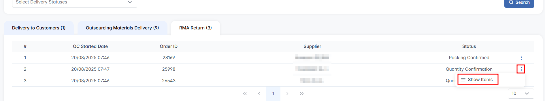 To begin reviewing an order, click three-dot menu next to the desired row and press Show Items. Pressing this button opens the Order ID page, where detailed delivery information becomes available.