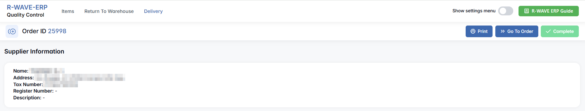 The order detail page displays key information about the supplier: Name, Address, Tax Number, and Register Number if available.