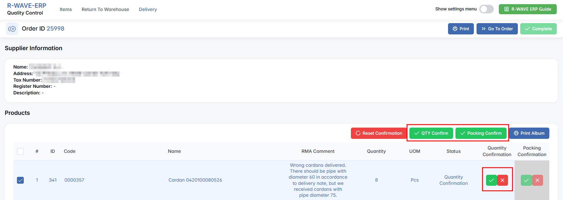 After that, press the Complete button to finalize the QC process. Passed items will be sent to Warehouse > QC Warehouse, while items that failed inspection will go to Warehouse > Isolator for further handling.