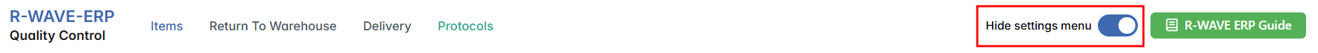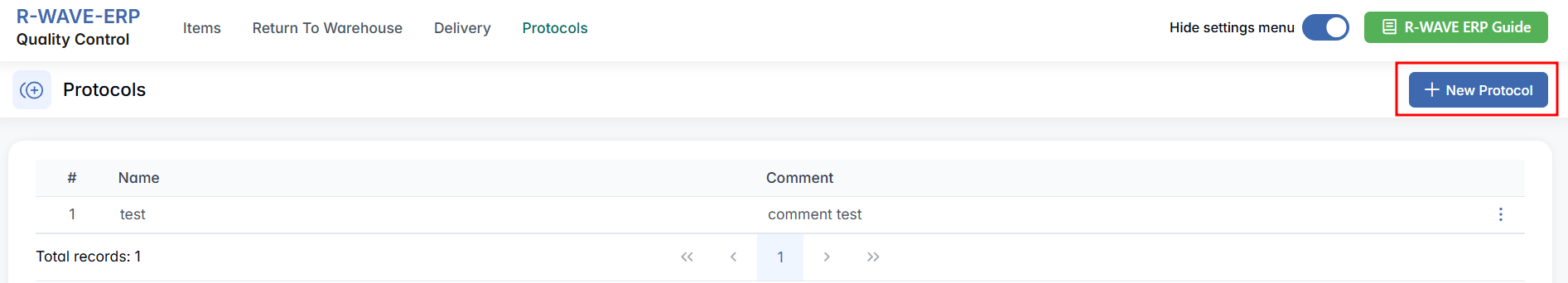 To support structured documentation and enforce standardized quality procedures, the Quality Control module in R-Wave ERP includes a hidden Protocols section. This additional tab becomes visible after activating Hidden Settings, and allows users to define reusable protocol templates — formal documents or checklists applied during the inspection of items.