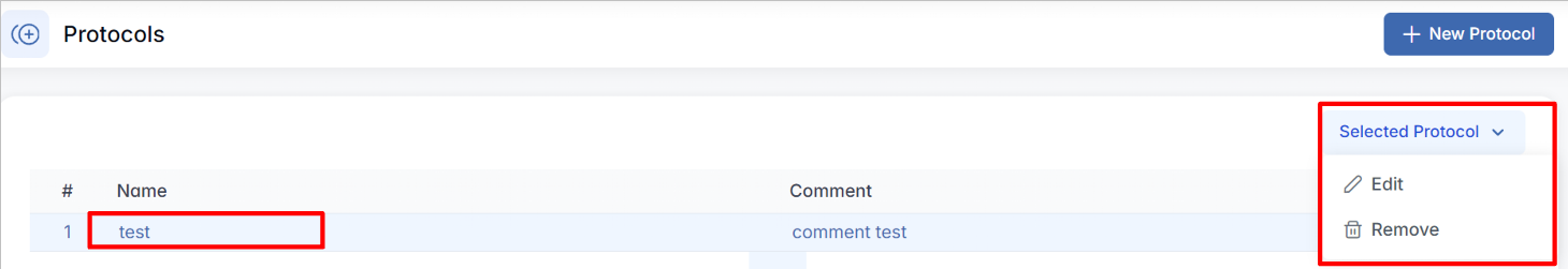 - Remove — deletes the selected protocol from the system (after confirmation). Use this option with caution, as deleted protocols cannot be restored.