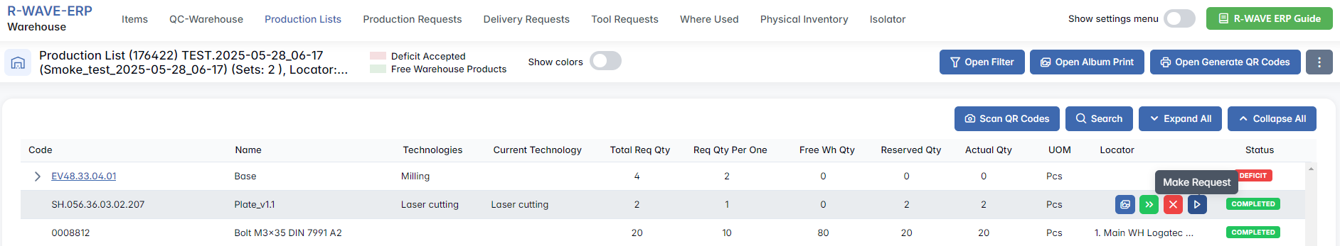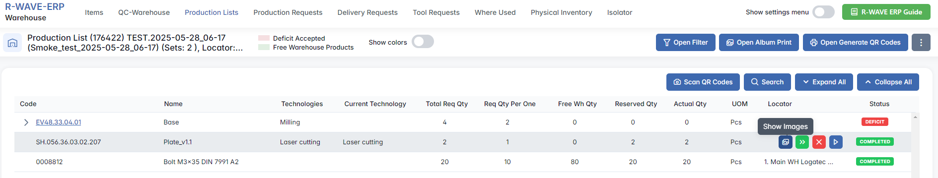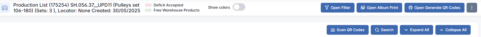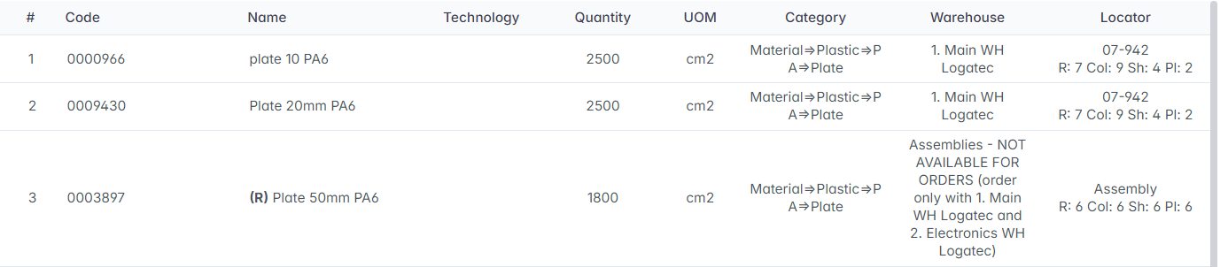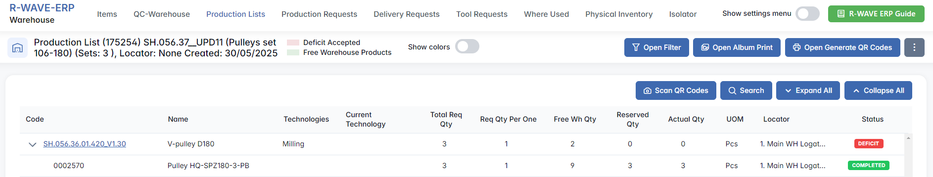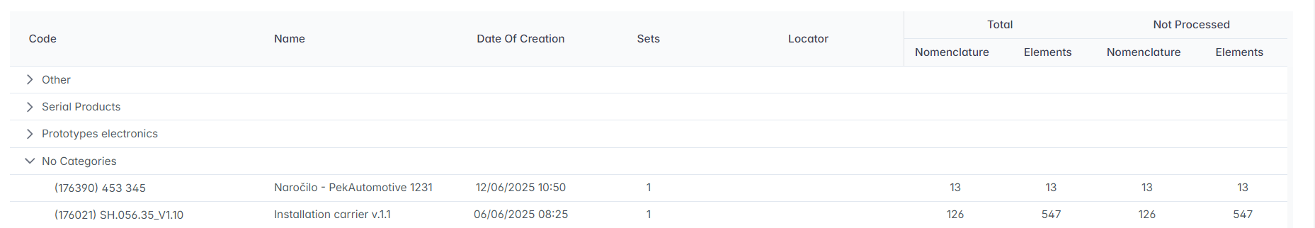 - Production List - represents an assembly sent to production, for which item availability is checked, missing items are ordered, and available stock is reserved and collected at a single location.