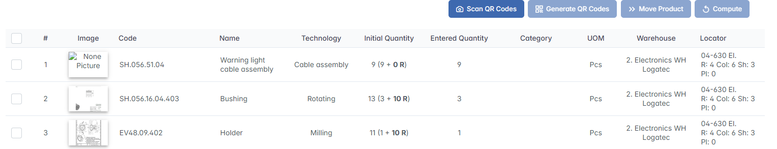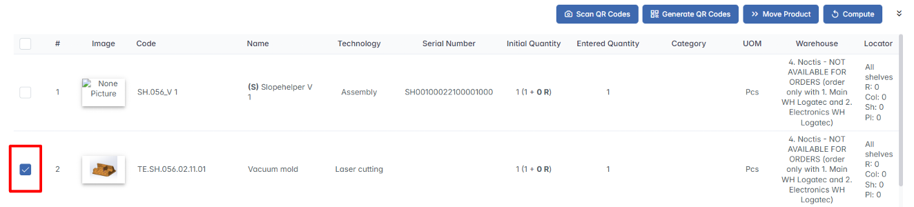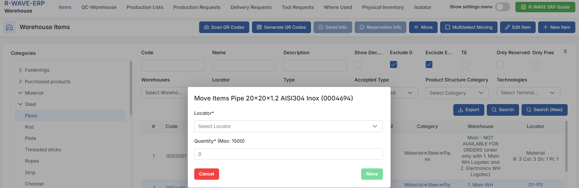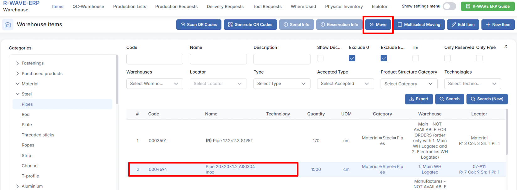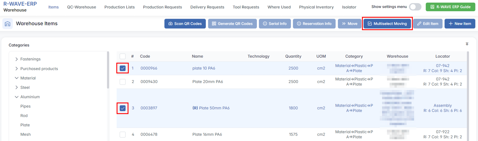 Multiselect Moving: If you need to move several items between locations or warehouses, click the MultiselectMoving to be able to select multiple records by checking the related checkboxes and click Move to perform a batch transfer.